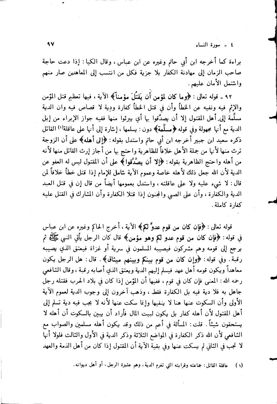 92- قوله تعالى: {وَمَا كَانَ لِمُؤْمِنٍ أَنْ يَقْتُلَ مُؤْمِنًا} الآية.
