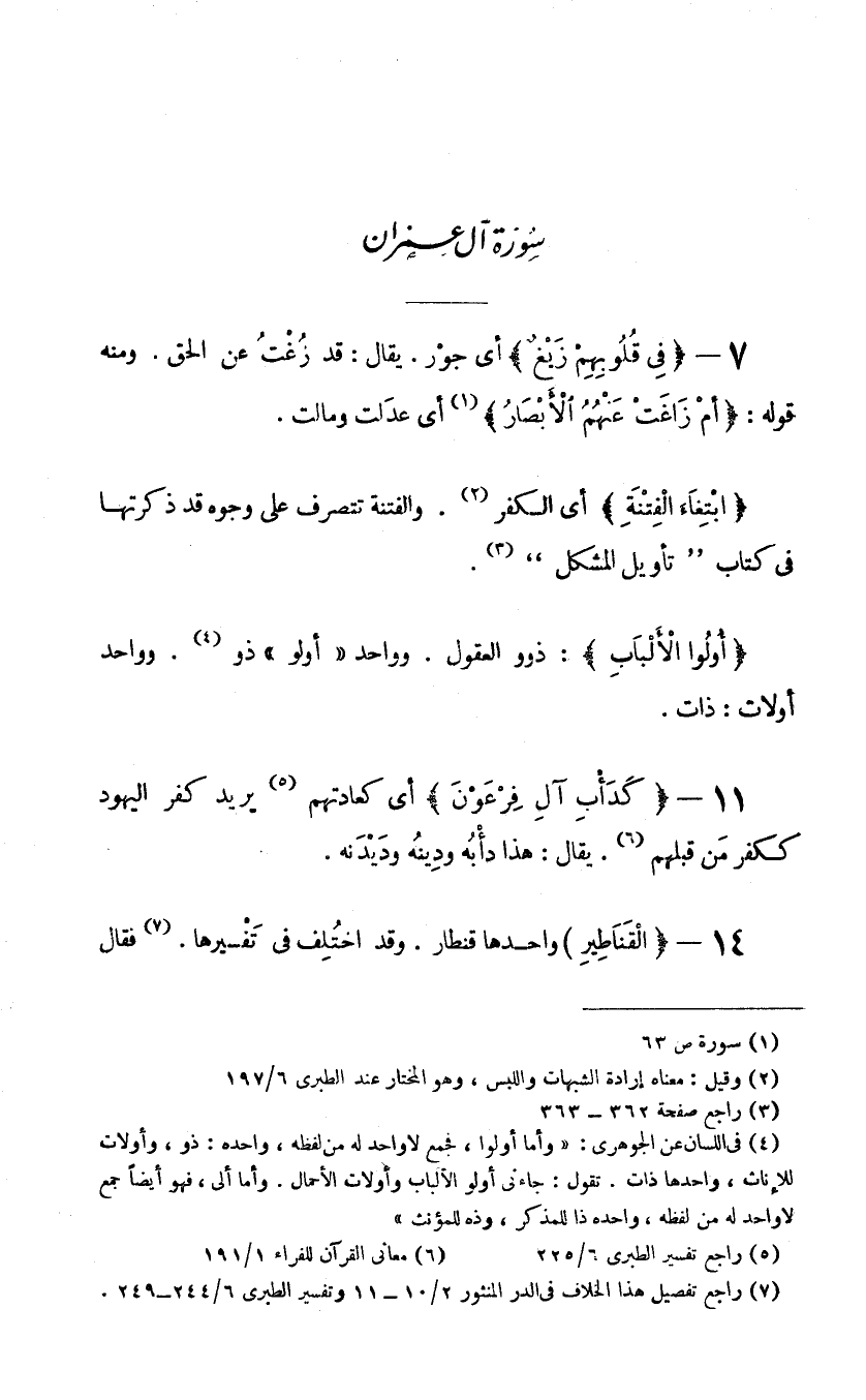 7- {فِي قُلُوبِهِمْ زَيْغٌ} أي جَوْر. يقال: قد زُغْتُ عن الحق. ومنه قوله: {أَمْ زَاغَتْ عَنْهُمُ الأَبْصَارُ} (1) أي عدَلت ومالت.