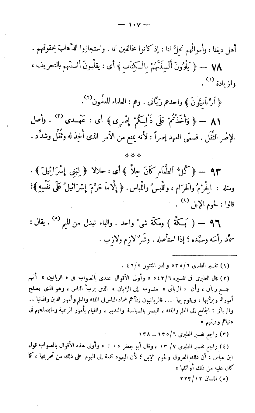 (1) قال الطبري في تفسيره 6/543 "وأولى الأقوال عندي بالصواب في "الربانيين" أنهم جمع رباني، وأن "الرباني" منسوب إلى "الربان" الذي يرب الناس، وهو الذي يصلح أمورهم ويربُّها، ويقوم بها ... .فالربانيون إذًا هم عماد الناس في الفقه والعلم وأمور الدين والدنيا.. والرباني: الجامع إلى العلم والفقه، البصر بالسياسة والتدبير، والقيام بأمور الرعية وما يصلحهم في دنياهم ودينهم".