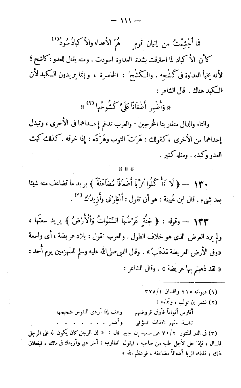 130- {لا تَأْكُلُوا الرِّبَا أَضْعَافًا مُضَاعَفَةً} يريد ما تضاعف منه شيئا بعد شيء. قال ابن عيينة: هو أن تقول: أَنْظِرْني وأَزِيدُك (3) .