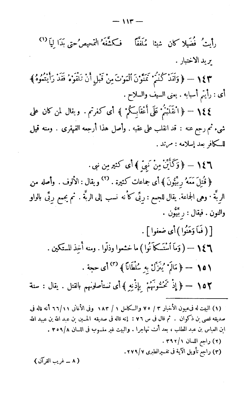 143- {وَلَقَدْ كُنْتُمْ تَمَنَّوْنَ الْمَوْتَ مِنْ قَبْلِ أَنْ تَلْقَوْهُ فَقَدْ رَأَيْتُمُوهُ} أي: رأيتم أسبابه. يعني السيف والسلاح.