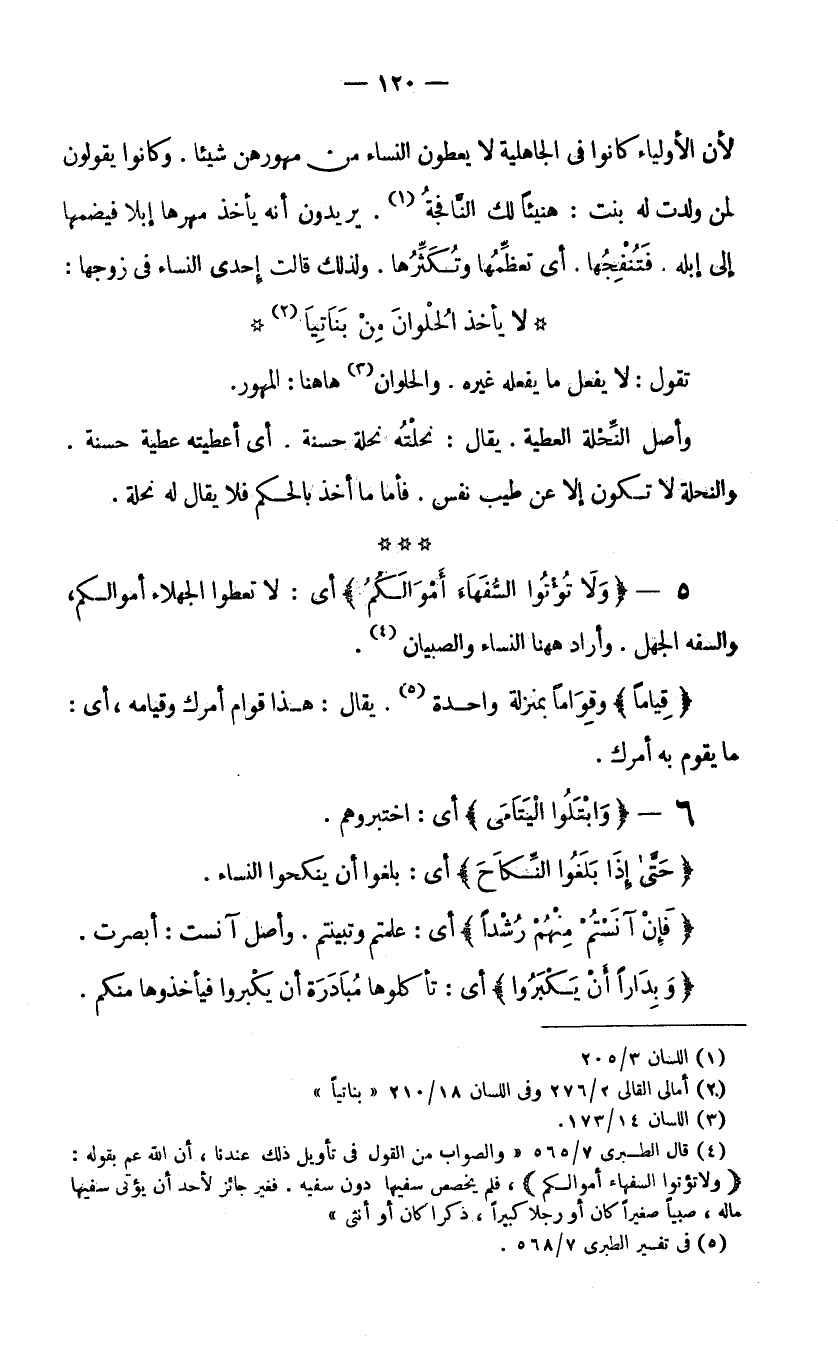 (2) قال الطبري 7/565 "والصواب من القول في تأويل ذلك عندنا، أن الله عم بقوله: (ولا تؤتوا السفهاء أموالكم) ، فلم يخصص سفيها دون سفيه. فغير جائز لأحد أن يؤتي سفيها ماله، صبيا صغيرا كان أو رجلا كبيرا، ذكرا كان أو أنثى".
