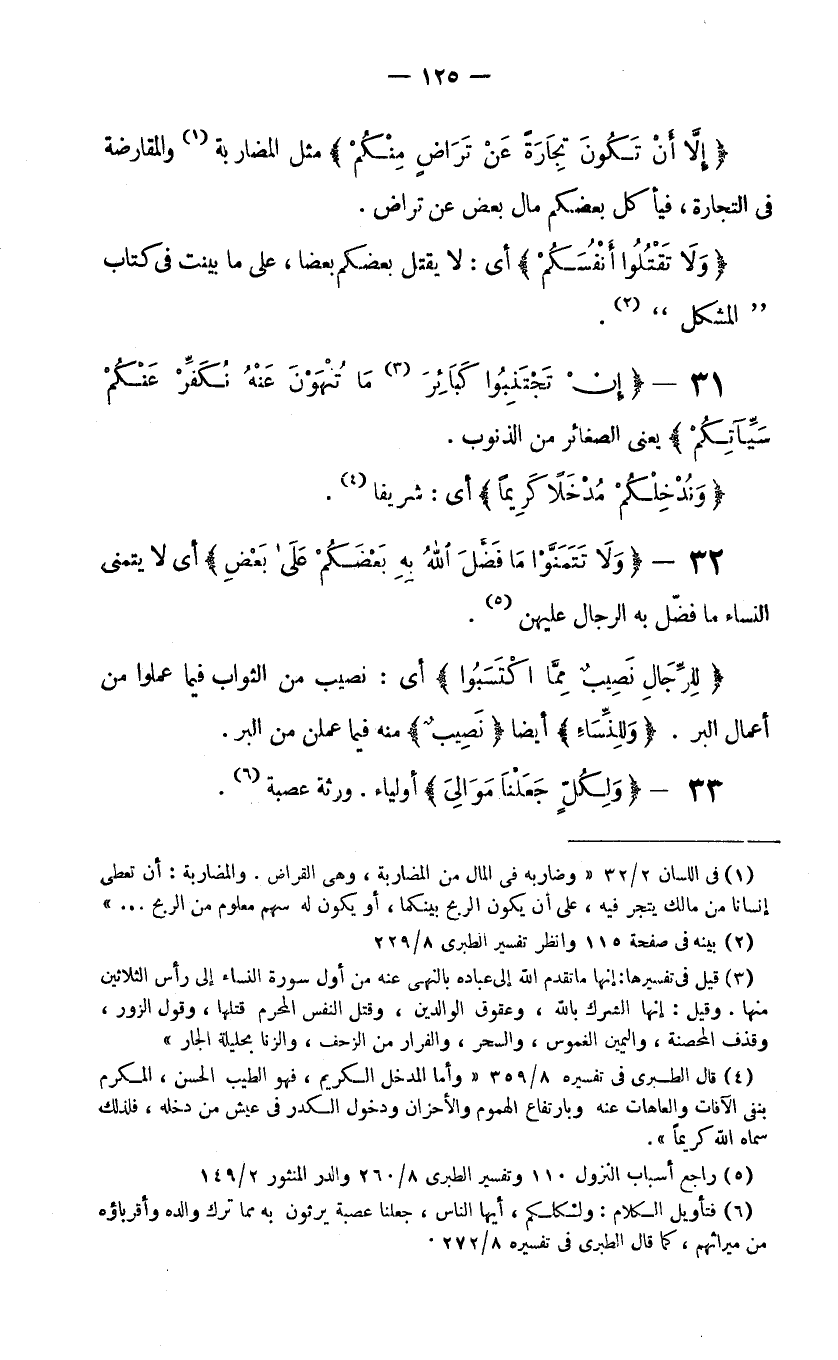 32- {وَلا تَتَمَنَّوْا مَا فَضَّلَ اللَّهُ بِهِ بَعْضَكُمْ عَلَى بَعْضٍ} أي لا يتمنى النساء ما فضّل به الرجال عليهن (5) .