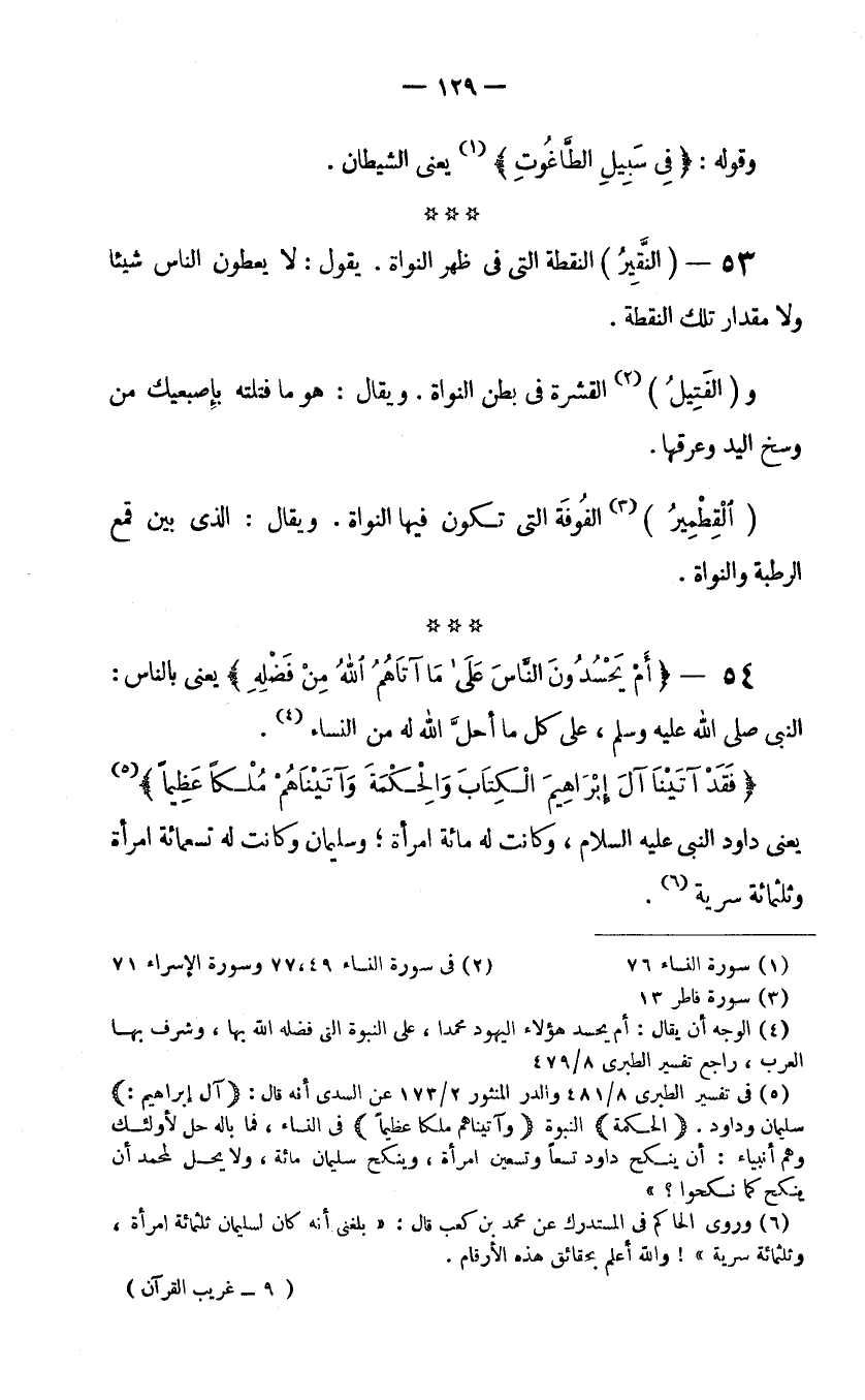 54- {أَمْ يَحْسُدُونَ النَّاسَ عَلَى مَا آتَاهُمُ اللَّهُ مِنْ فَضْلِهِ} يعني بالناس: النبي صلى الله عليه وسلمُ على كل ما أحلَّ الله له من النساء (4) .