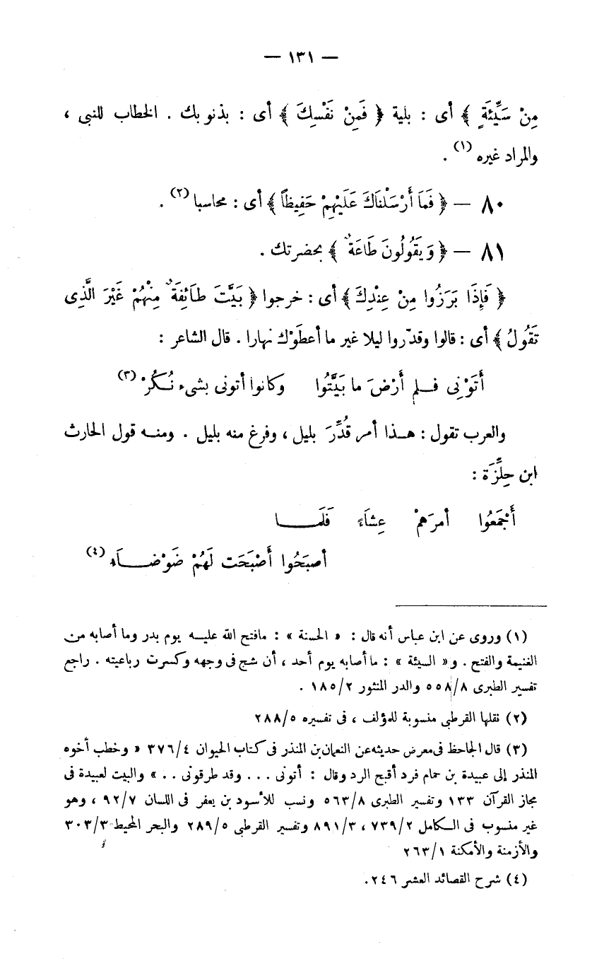 (1) وروي عن ابن عباس أنه قال: "الحسنة": ما فتح الله عليه يوم بدر وما أصابه من الغنيمة والفتح. و"السيئة": ما أصابه يوم أحد، أن شج في وجهه وكسرت رباعيته. راجع تفسير الطبري 8/558 والدر المنثور 2/185.