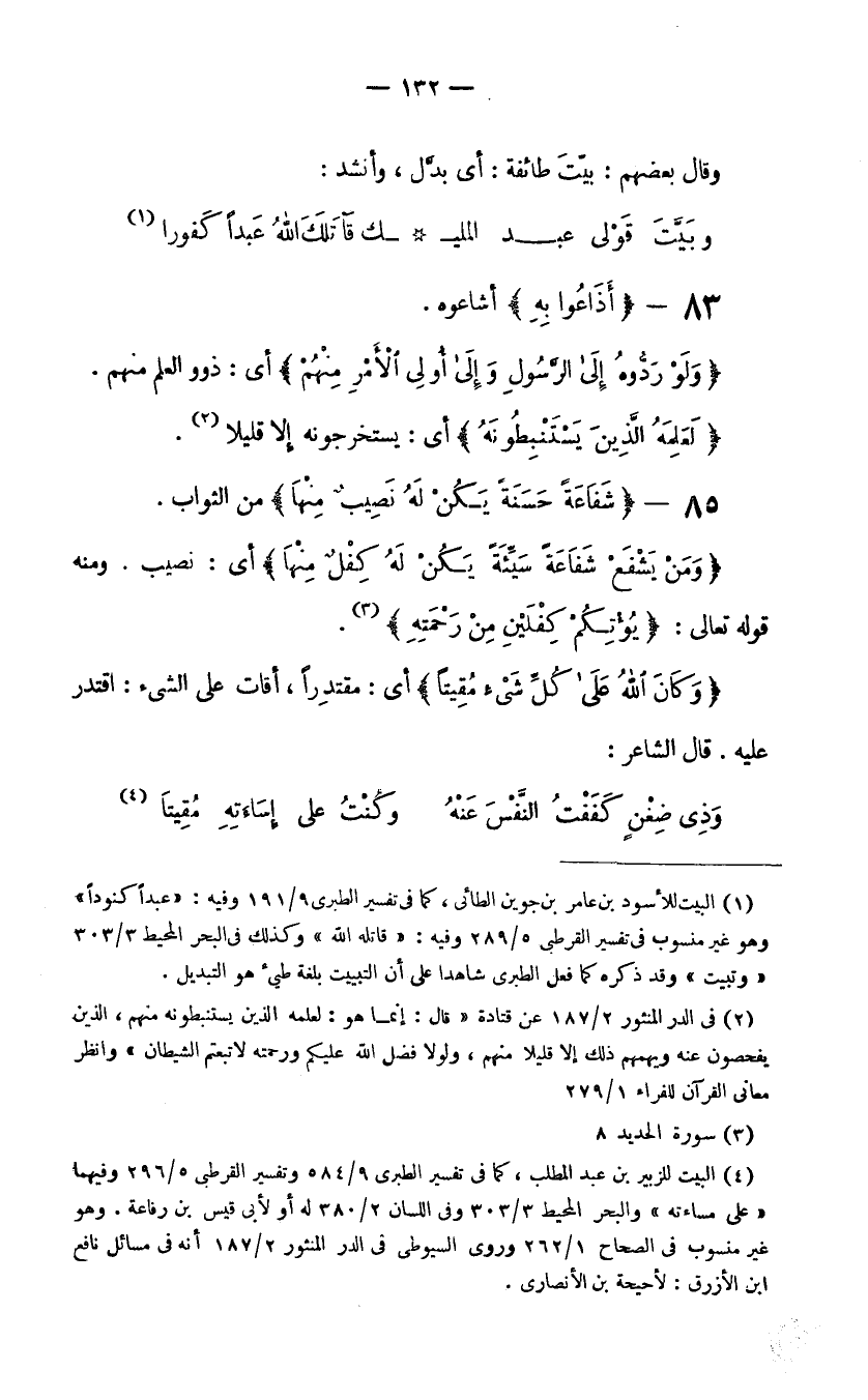 {وَكَانَ اللَّهُ عَلَى كُلِّ شَيْءٍ مُقِيتًا} أي: مُقْتدِرًا أقات على الشيء: اقتدر عليه. قال الشاعر: