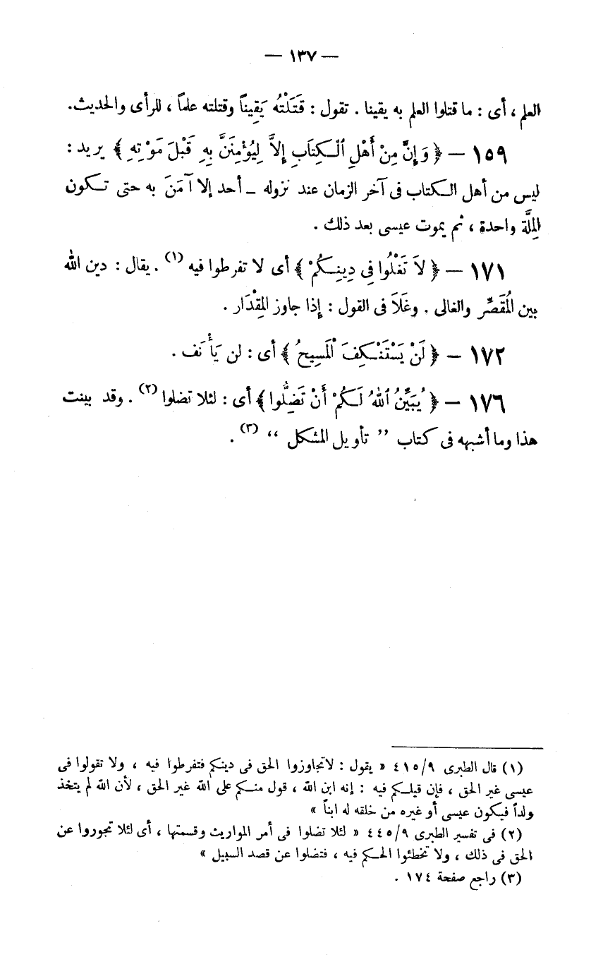159- {وَإِنْ مِنْ أَهْلِ الْكِتَابِ إِلا لَيُؤْمِنَنَّ بِهِ قَبْلَ مَوْتِهِ} يريد: ليس من أهل الكتاب في آخر الزمان عند نزوله - أحد إلا آمَنَ به حتى تكون المِلَّة واحدة، ثم يموت عيسى بعد ذلك.