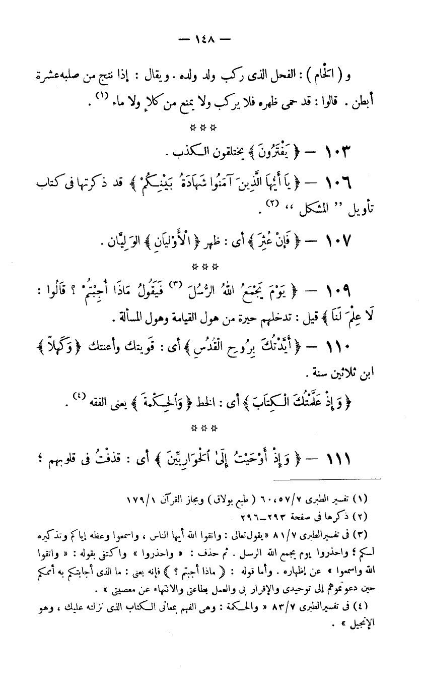 106- {يَا أَيُّهَا الَّذِينَ آمَنُوا شَهَادَةُ بَيْنِكُمْ} قد ذكرتها في كتاب تأويل "المشكل" (2) .