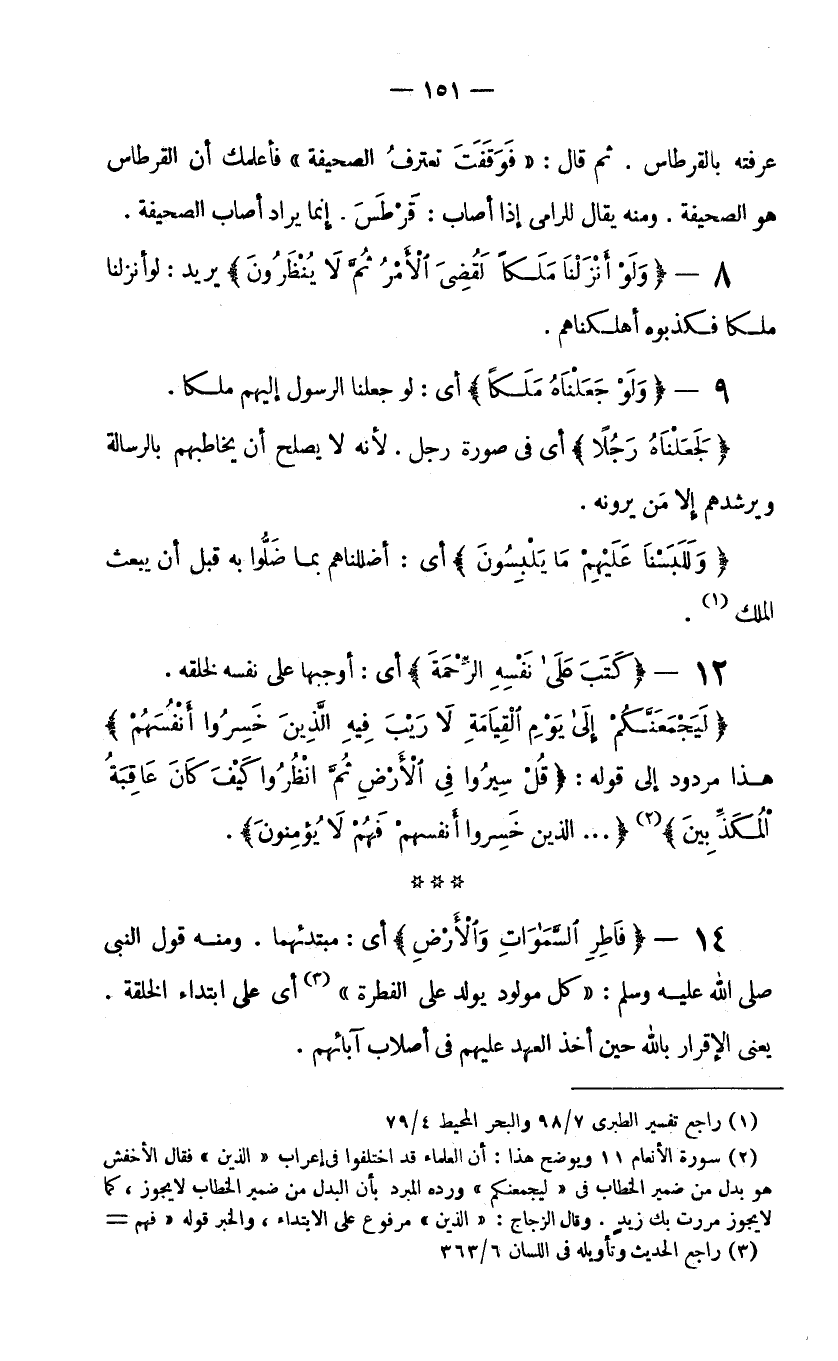 (1) سورة الأنعام 11 ويوضح هذا: أن العلماء قد اختلفوا في إعراب "الذين" فقال الأخفش هو بدل من ضمير الخطاب في "ليجمعنكم" ورده المبرد بأن البدل من ضمير الخطاب لا يجوز، كما لا يجوز مررت بك زيد. وقال الزجاج: "الذين" مرفوع على الابتداء، والخبر قوله "فهم لا يؤمنون" ودخلت الفاء لما تضمن المبتدأ من معنى الشرط، كأنه قيل: من يخسر نفسه فهو لا يؤمن. وجاء في تفسير القرطبي 6/396 أن الذي قاله "الزجاج أجود ما قيل فيه ... قال القتيبي: يجوز أن يكون "الذين" خبرا، أو على البدل من "المكذبين" الذين تقدم ذكرهم، أو على النعت لهم" وقال الطبري 7/101 "وموضع "الذين" نصب على الرد على الكاف والميم في قوله: "ليجمعنكم" على وجه البيان عنها، وذلك أن الذين خسروا أنفسهم هم الذين خوطبوا بقوله: "ليجمعنكم".