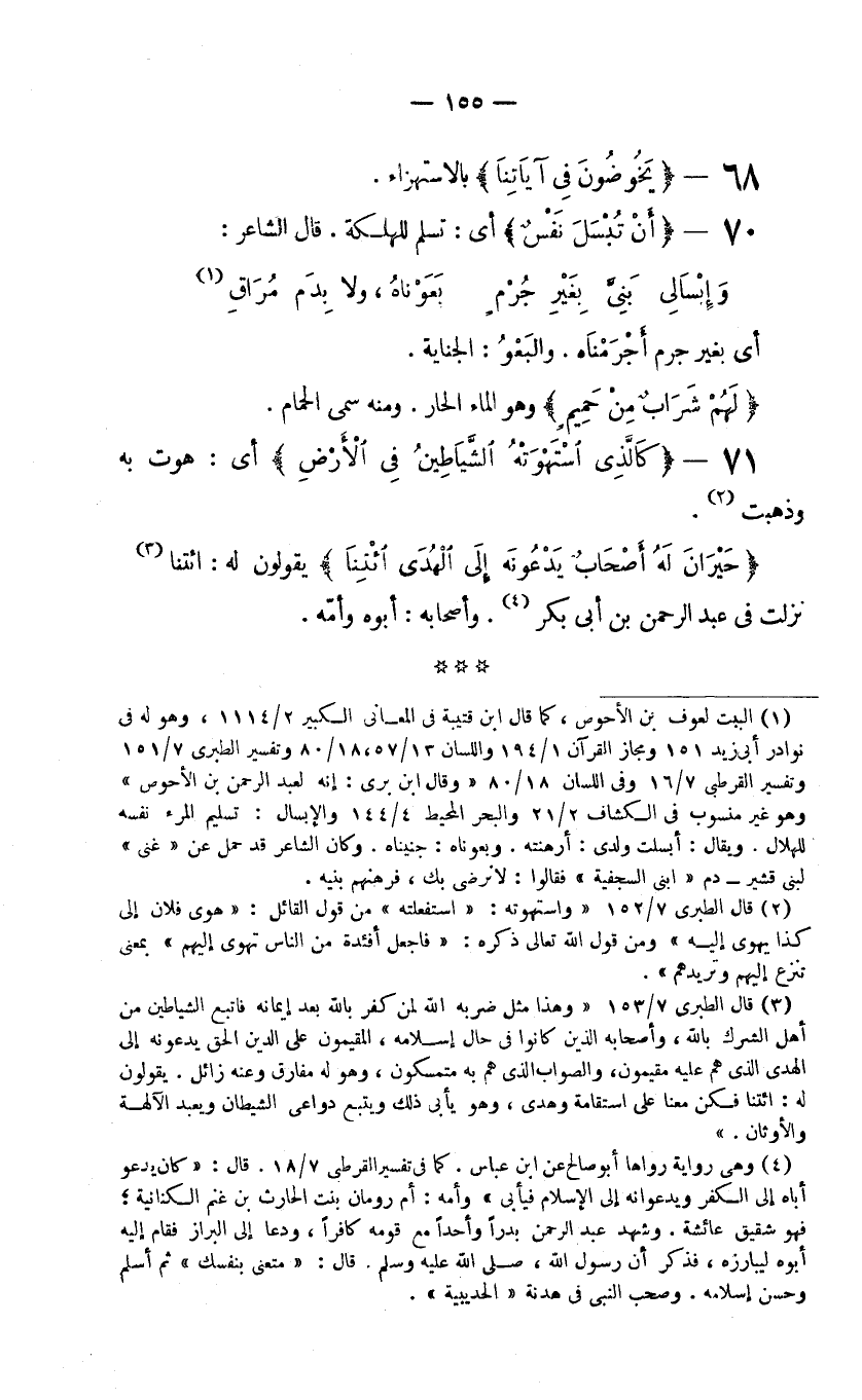70- {أَنْ تُبْسَلَ نَفْسٌ} أي: تسلم للهلكة. قال الشاعر: