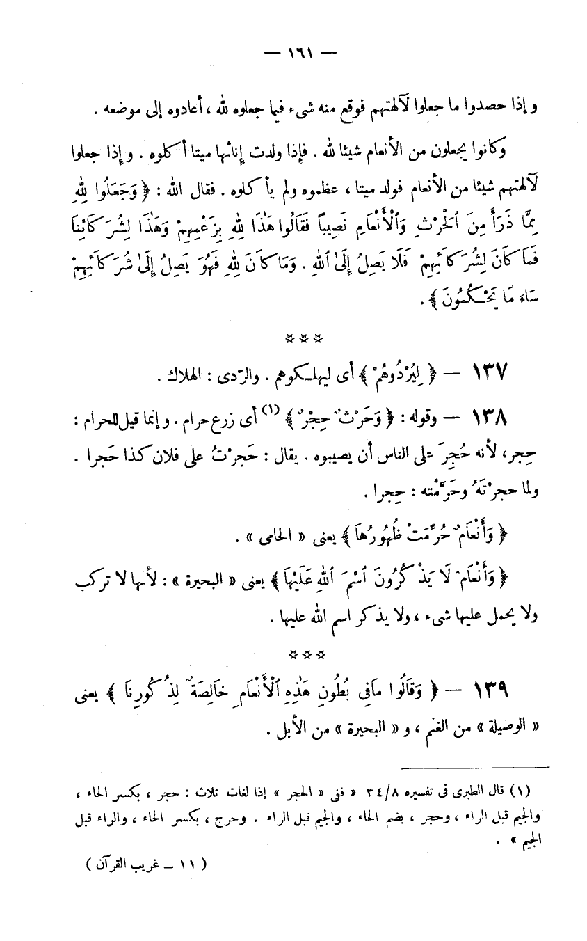 138- وقوله: {وَحَرْثٌ حِجْرٌ} (1) أي زرع حرام. وإنما قيل للحرام: حِجْر لأنه حُجِرَ على الناس أن يصيبوه. يقال: حَجرْت على فلان كذا حَجرا. ولما حجرْتَه وحَرَّمْتَهُ: حِجرا.
