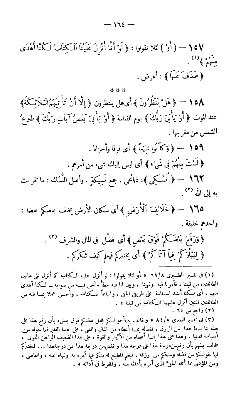 (3) في تفسير الطبري 8/84 "وخالف بين أحوالكم فجعل بعضكم فوق بعض، بأن رفع هذا على هذا بما بسط لهذا من الرزق، ففضله بما أعطاه من المال والغنى، على هذا الفقير فيما خوله من أسباب الدنيا. وهذا على هذا بما أعطاه من الأَيْد والقوة، على هذا الضعيف الواهن القوى، فخالف بينهم بأن رفع من درجة هذا على درجة هذا وخفض من درجة هذا عن درجة هذا ... ليختبركم فيما خولكم من فضله ومنحكم من رزقه، فيعلم المطيع له منكم فيما أمره به ونهاه عنه، والعاصي، ومن المؤدي مما أتاه الحق الذي أمره بأدائه منه، والمفرط في أدائه".