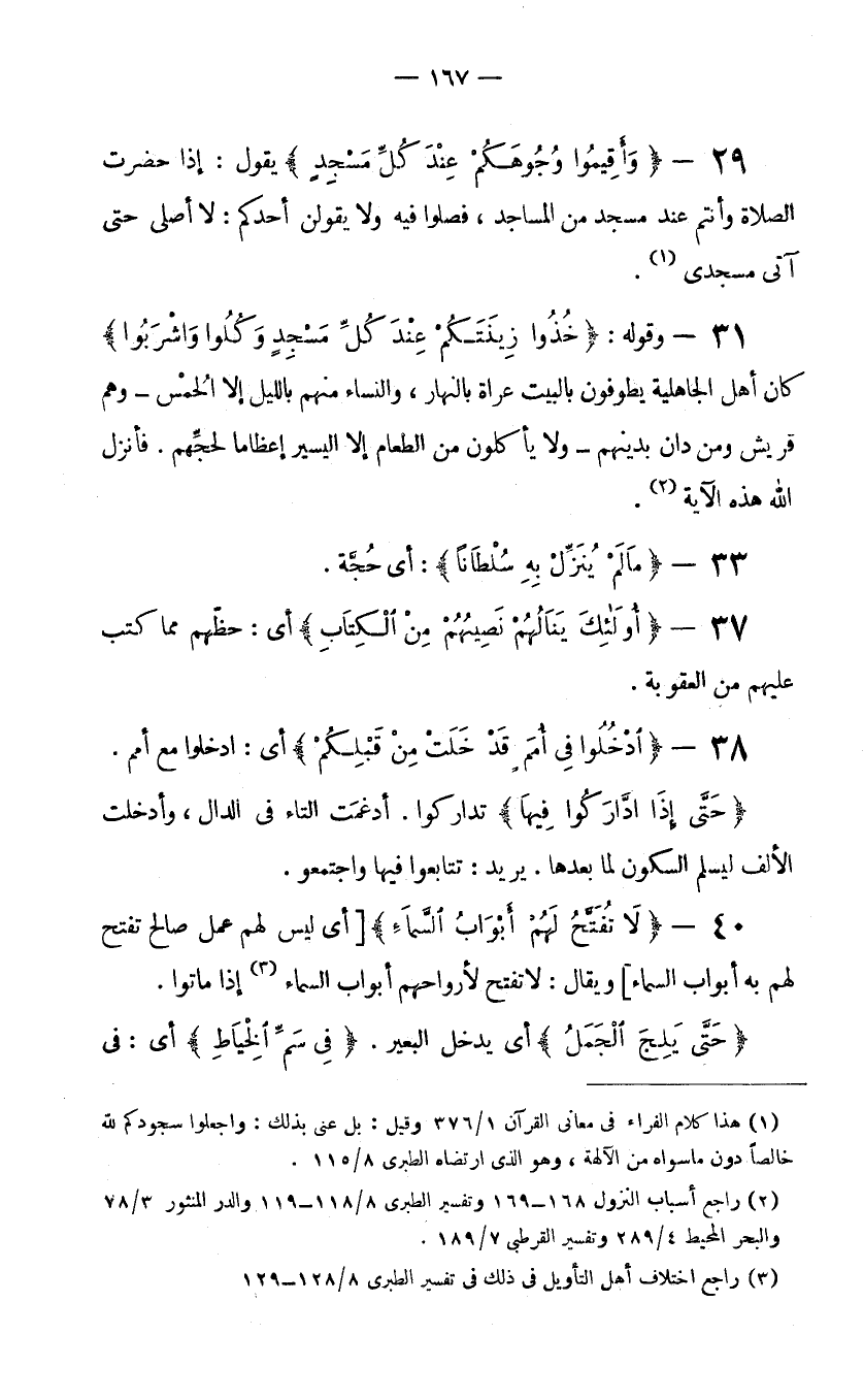 31- وقوله: {خُذُوا زِينَتَكُمْ عِنْدَ كُلِّ مَسْجِدٍ وَكُلُوا وَاشْرَبُوا} كان أهل الجاهلية يطوفون بالبيت عراة بالنهار والنساء منهم بالليل إلا الحُمْس-وهم قريش ومن دان بدينهم- ولا يأكلون من الطعام إلا اليسير إعظاما لحجِّهم. فأنزل الله هذه الآية (2) .