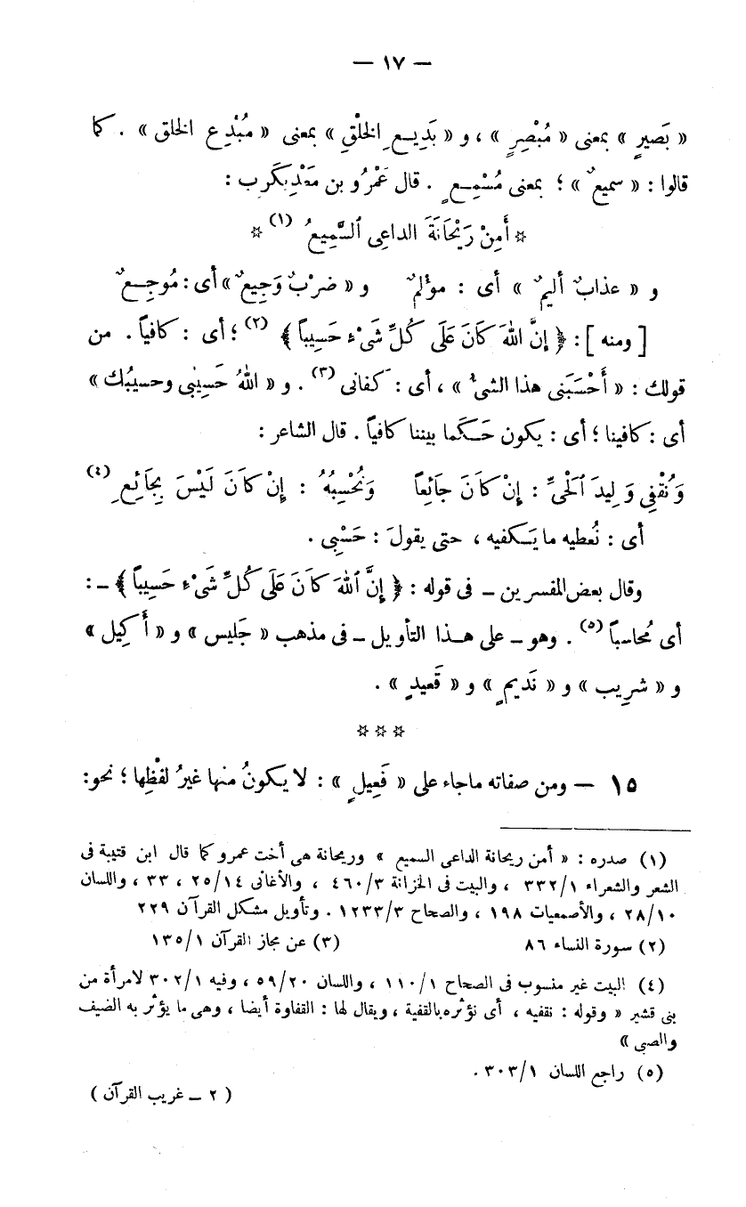 "بَصيرٍ" بمعنى "مُبْصِرٍ"، و "بَدِيعِ الخلْقِ" بمعنى "مُبْدِع الخلق". كما قالوا: "سميعٌ"؛ بمعنى مُسْمِعٍ. قال عَمْرُو بن مَعْدِيكَرِب: