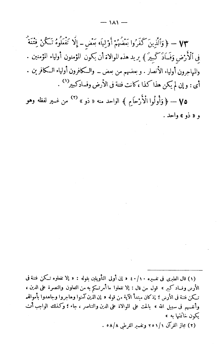 (1) قال الطبري في تفسيره 10/40 "إن أولى التأويلين بقوله: (إلا تفعلوه تكن فتنة في الأرض وفساد كبير) قول من قال: إلا تفعلوا ما أمرتكم به من التعاون والنصرة على الدين، تكن فتنة في الأرض؛ إذ كان مبتدأ الآية من قوله (إن الذين آمنوا وهاجروا وجاهدوا بأموالهم وأنفسهم في سبيل الله) بالحث على الموالاة على الدين والتناصر، جاء؛ وكذلك الواجب أن يكون خاتمتها به".