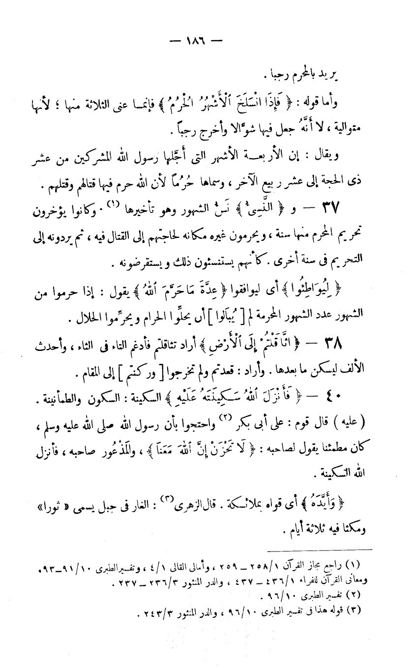 37- و {النَّسِيءُ} نَسْءُ الشهور، وهو تأخيرها (1) . وكانوا يؤخرون تحريم المحرم منها سنة، ويحرمون غيره مكانه لحاجتهم إلى القتال فيه، ثم يردونه إلى التحريم في سنة أخرى. كأنهم يستنسئون ذلك ويستقرضونه.