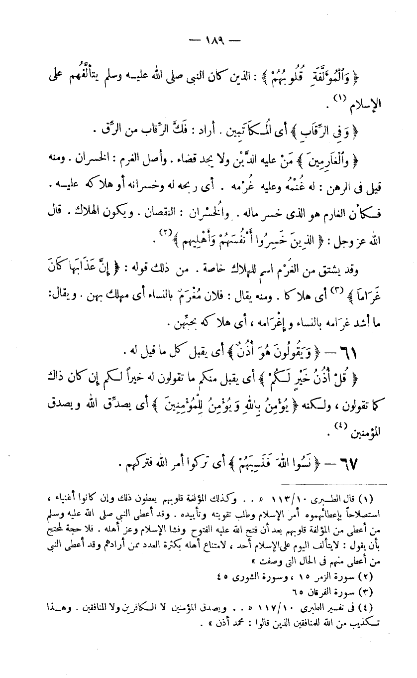 (1) قال الطبري 10/113 ".. وكذلك المؤلفة قلوبهم يعطون ذلك وإن كانوا أغنياء، استصلاحا بإعطائهموه أمر الإسلام وطلب تقويته وتأييده. وقد أعطى النبي صلى الله عليه وسلم من أعطى من المؤلفة قلوبهم بعد أن فتح الله عليه الفتوح وفشا الإسلام وعز أهله. فلا حجة لمحتج بأن يقول: لا يتألف اليوم على الإسلام أحد، لامتناع أهله بكثرة العدد ممن أرادهم وقد أعطى النبي من أعطى منهم في الحال التي وصفت".