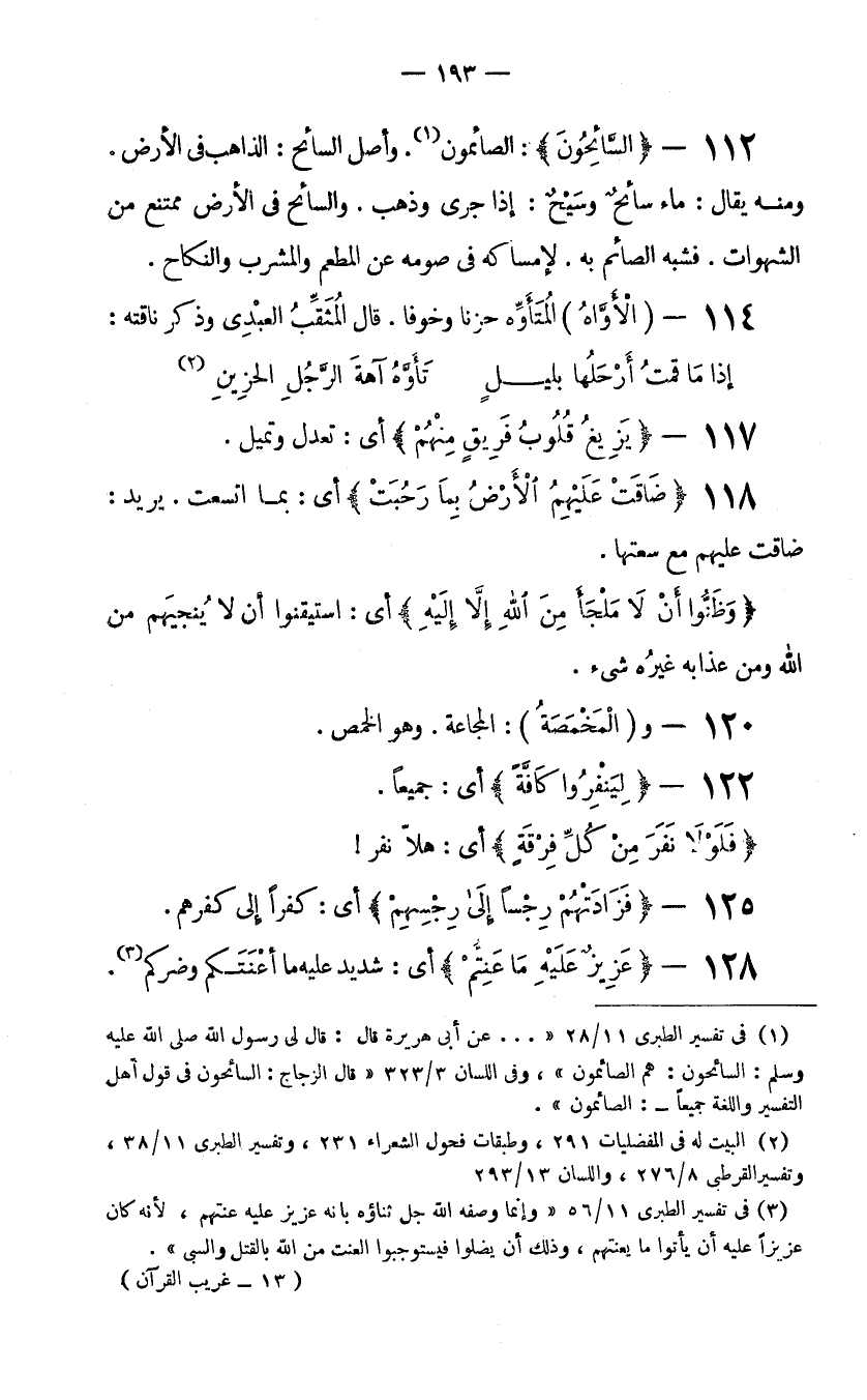 (1) في تفسير الطبري 11/28 " ... عن أبي هريرة قال: قال لي رسول الله صلى الله عليه وسلم: السائحون: هم الصائمون"، وفي اللسان 3/323 "قال الزجاج: السائحون في قول أهل التفسير واللغة جميعا -: الصائمون".