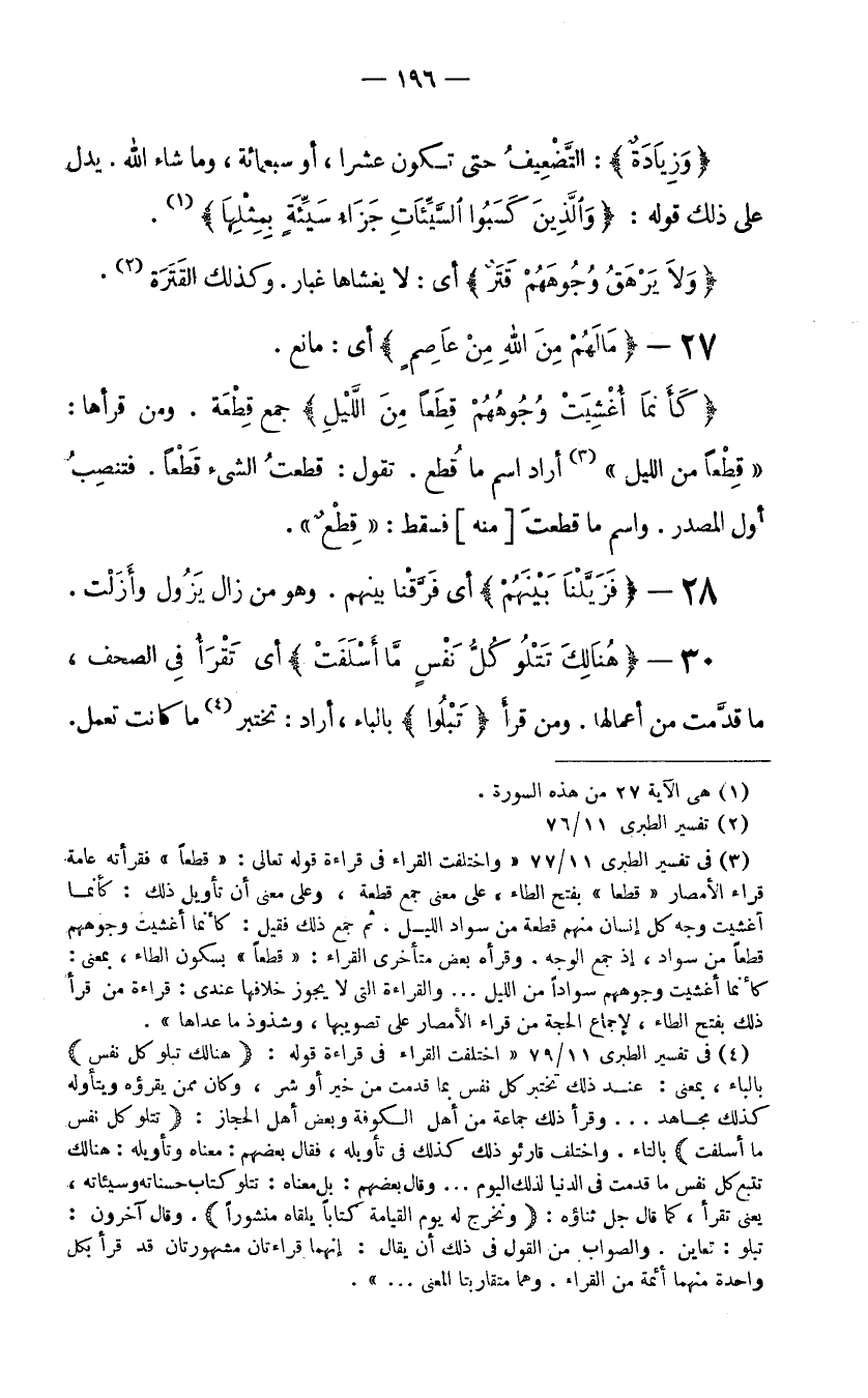 (3) في تفسير الطبري 11/79 "اختلفت القراء في قراءة قوله: (هنالك تبلو كل نفس) بالباء، بمعنى: عند ذلك تختبر كل نفس بما قدمت من خير أو شر، وكان ممن يقرؤه ويتأوله كذلك مجاهد ... وقرأ ذلك جماعة من أهل الكوفة وبعض أهل الحجاز: (تتلو كل نفس ما أسلفت) بالتاء. واختلف قارئو ذلك كذلك في تأويله، فقال بعضهم: معناه وتأويله: هنالك تتبع كل نفس ما قدمت في الدنيا لذلك اليوم ... وقال بعضهم: بل معناه: تتلو كتاب حسناته وسيئاته، يعني تقرأ، كما قال جل ثناؤه: (ونخرج له يوم القيامة كتابا يلقاه منشورا) . وقال آخرون: تبلو: تعاين. والصواب من القول في ذلك أن يقال: إنهما قراءتان مشهورتان قد قرأ بكل واحدة منهما أئمة من القراء. وهما متقاربتا المعنى ... ".