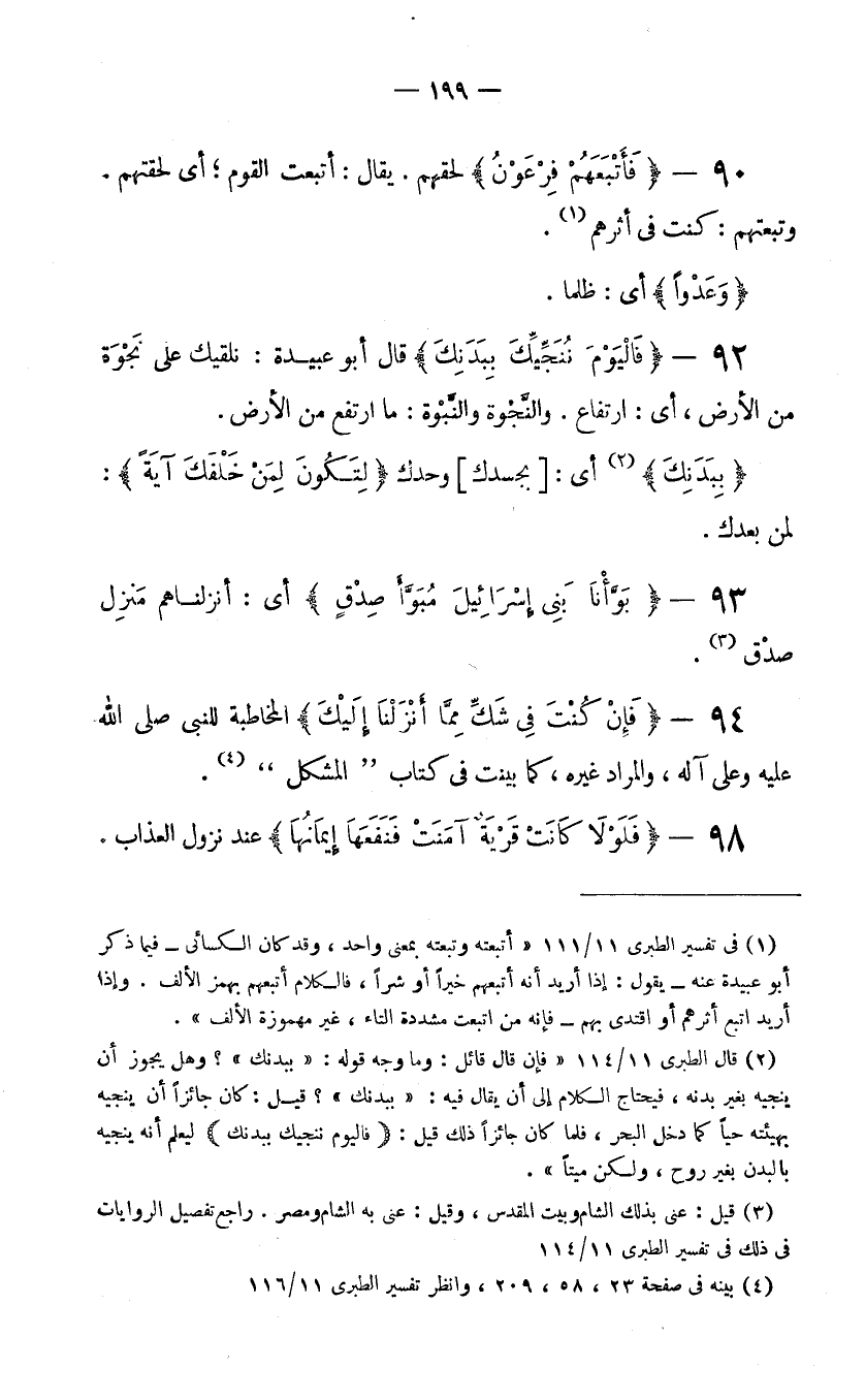 (2) قال الطبري 11/114 " فإن قال قائل: وما وجه قوله: "ببدنك"؟ وهل يجوز أن ينجيه بغير بدنه، فيحتاج الكلام إلى أن يقال فيه: "ببدنك"؟ قيل: كان جائزا أن ينجيه بهيئته حيا كما دخل البحر، فلما كان جائزا ذلك قيل: (فاليوم ننجيك ببدنك) ليعلم أنه ينجيه بالبدن بغير روح، ولكن ميتا".