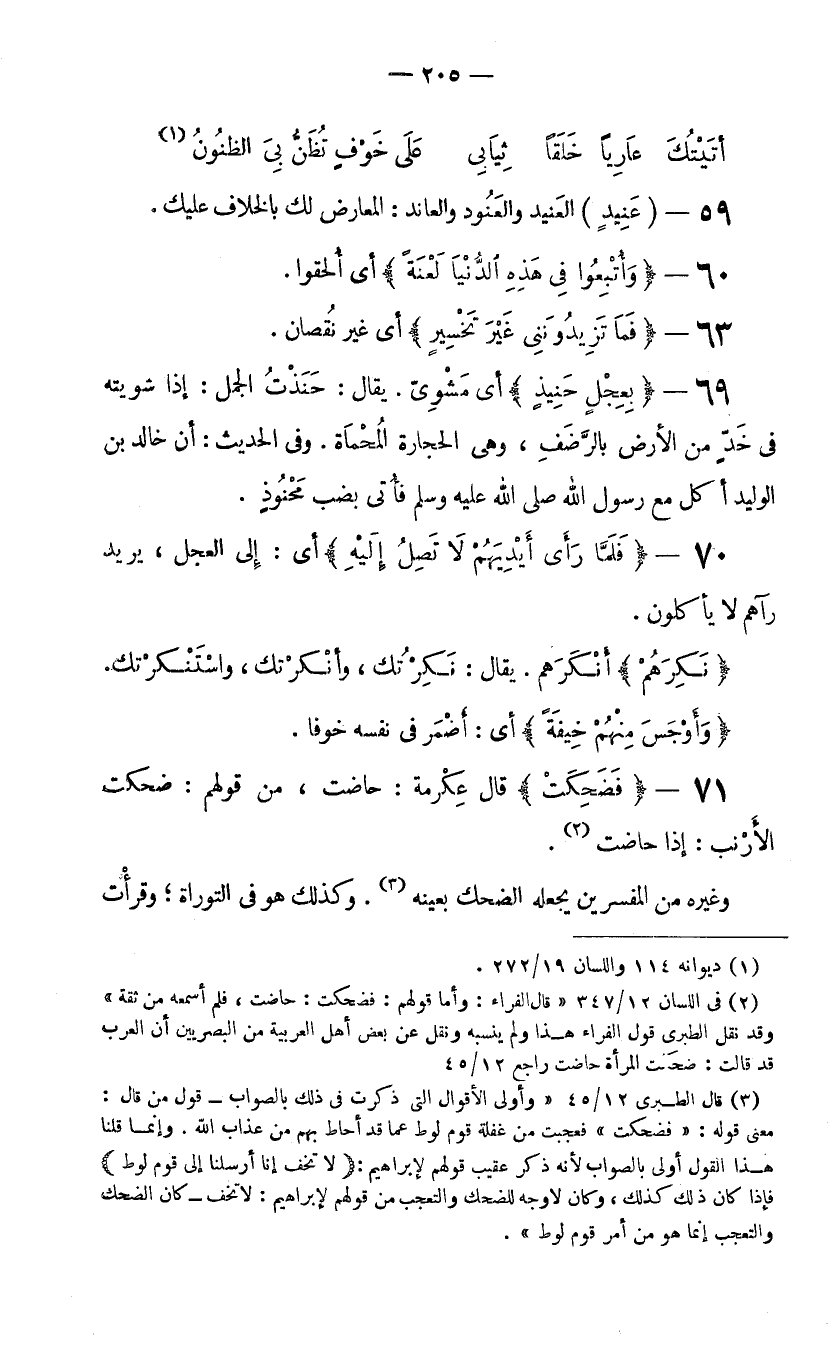 (3) قال الطبري 12/45 "وأولى الأقوال التي ذكرت في ذلك بالصواب - قول من قال: معنى قوله: "فضحكت" فعجبت من غفلة قوم لوط عما قد أحاط بهم من عذاب الله. وإنما قلنا هذا القول أولى بالصواب لأنه ذكر عقيب قولهم لإبراهيم: (لا تخف إنا أرسلنا إلى قوم لوط) فإذا كان ذلك كذلك، وكان لا وجه للضحك والتعجب من قولهم لإبراهيم: لا تخف - كان الضحك والتعجب إنما هو من أمر قوم لوط".