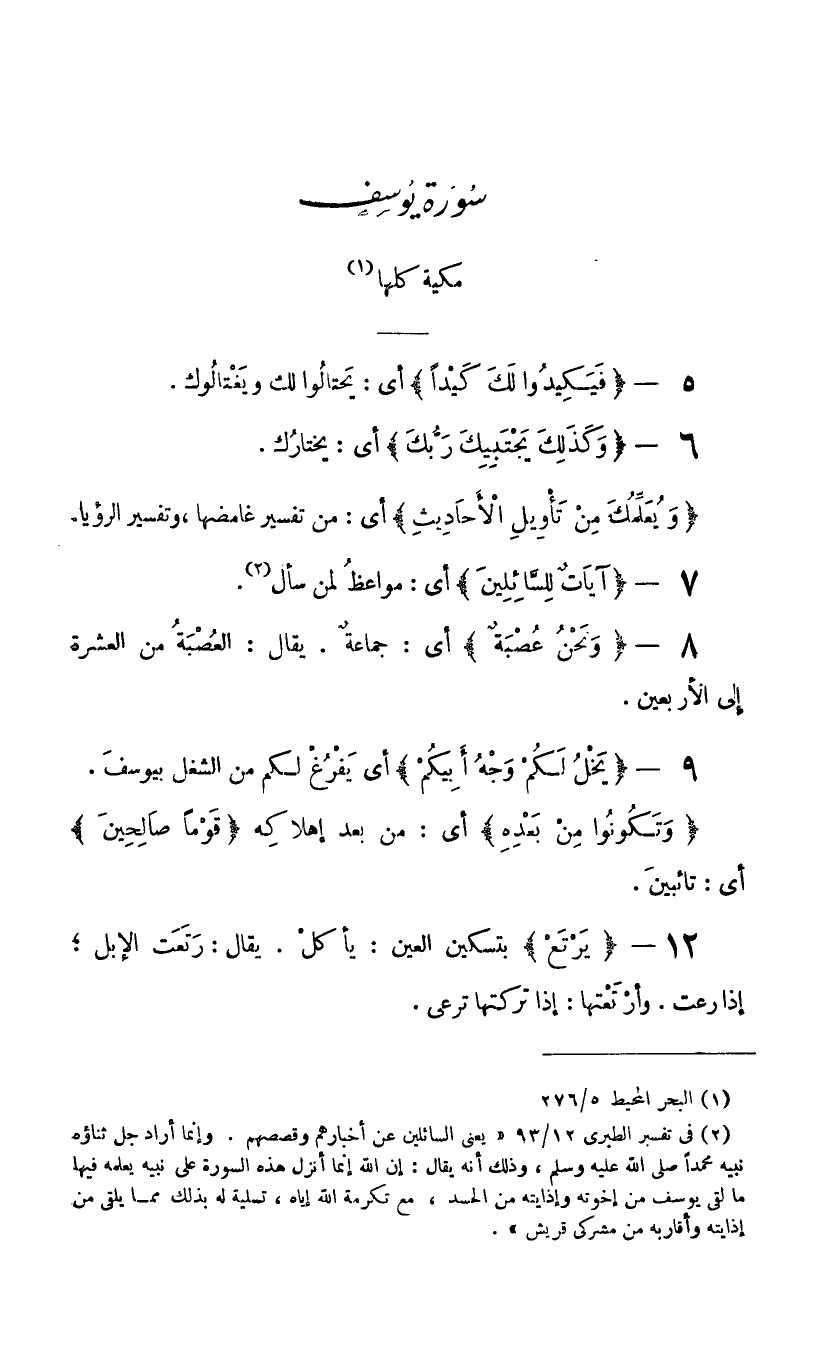 (1) في تفسير الطبري 12/93 "يعني السائلين عن أخبارهم وقصصهم. وإنما أراد جل ثناؤه نبيه محمدا صلى الله عليه وسلم، وذلك أنه يقال: إن الله إنما أنزل هذه السورة على نبيه يعلمه فيها ما لقي يوسف من إخوته وإذايته من الحسد، مع تكرمة الله إياه، تسلية له بذلك مما يلقى من إذايته وأقاربه من مشركي قريش".