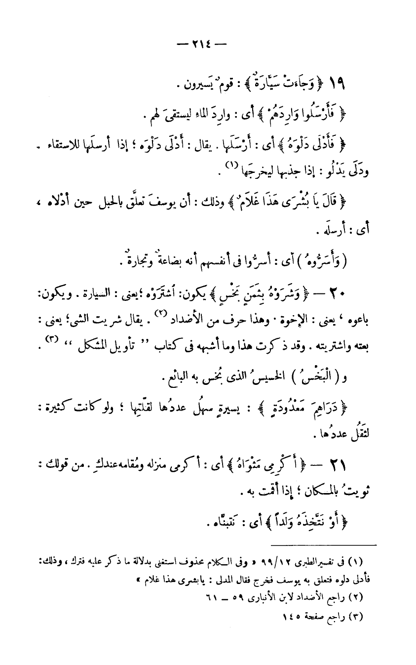 20- {وَشَرَوْهُ بِثَمَنٍ بَخْسٍ} يكون: اشْتَرَوْه؛ يعني: السيارة. ويكون: باعوهُ، يعني: الإخوة. وهذا حرف من الأضداد (2) . يقال: شريت الشيء؛ يعني: بعته واشتريته. وقد ذكرت هذا وما أشبهه في كتاب "تأويل المشكل" (3) .