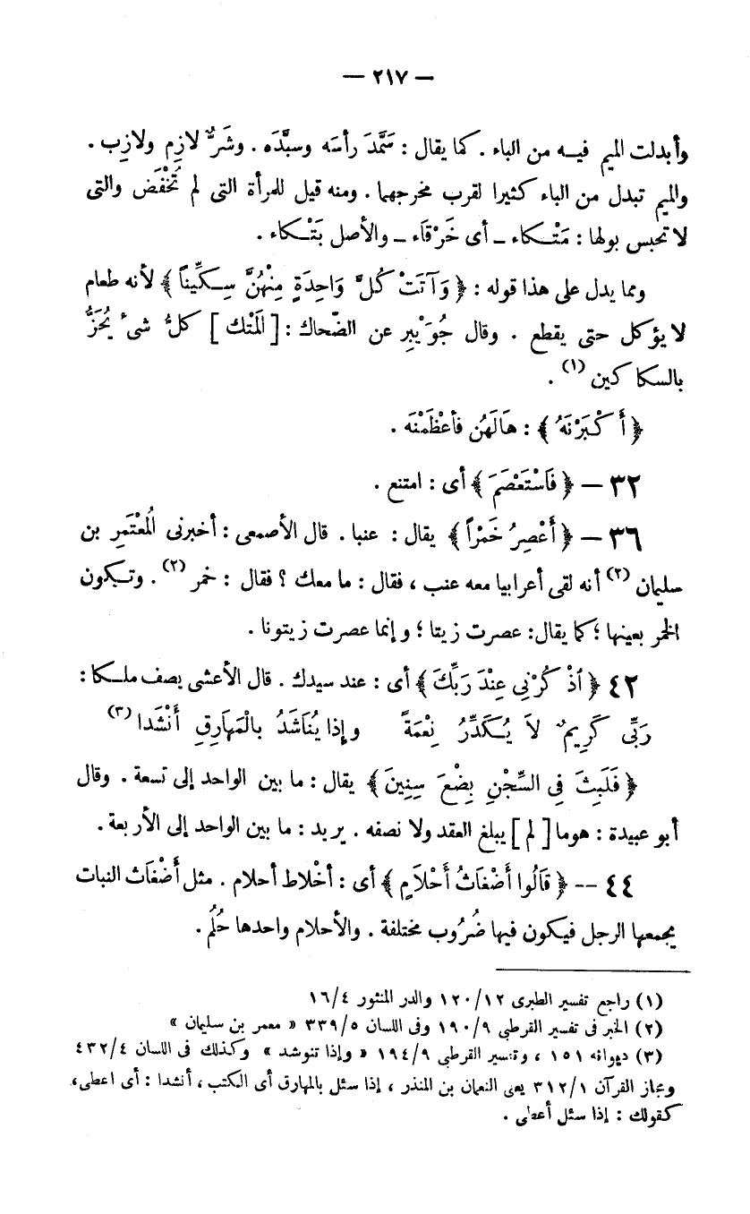 36- {أَعْصِرُ خَمْرًا} يقال: عنبا. قال الأصمعي: أخبرني المُعْتَمِرُ بنُ سليمانَ (2) أنه لقي أعرابيًّا معه عنب، فقال: ما معك؟ فقال: خمر. (3) وتكون الخمر بعينها؛ كما يقال: عصرت زيتا؛ وإنما عصرت زيتونا.