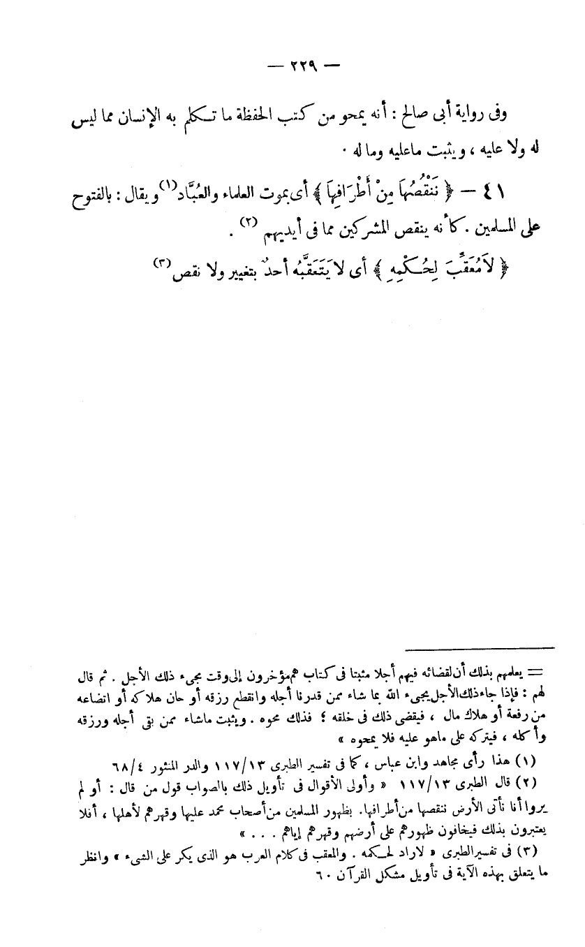 (2) قال الطبري 13/117 "وأولى الأقوال في تأويل ذلك بالصواب قول من قال: أولم يروا أنا نأتي الأرض ننقصها من أطرافها. بظهور المسلمين من أصحاب محمد عليها وقهرهم لأهلها، أفلا يعتبرون بذلك فيخافون ظهورهم على أرضهم وقهرهم إياهم ... ".