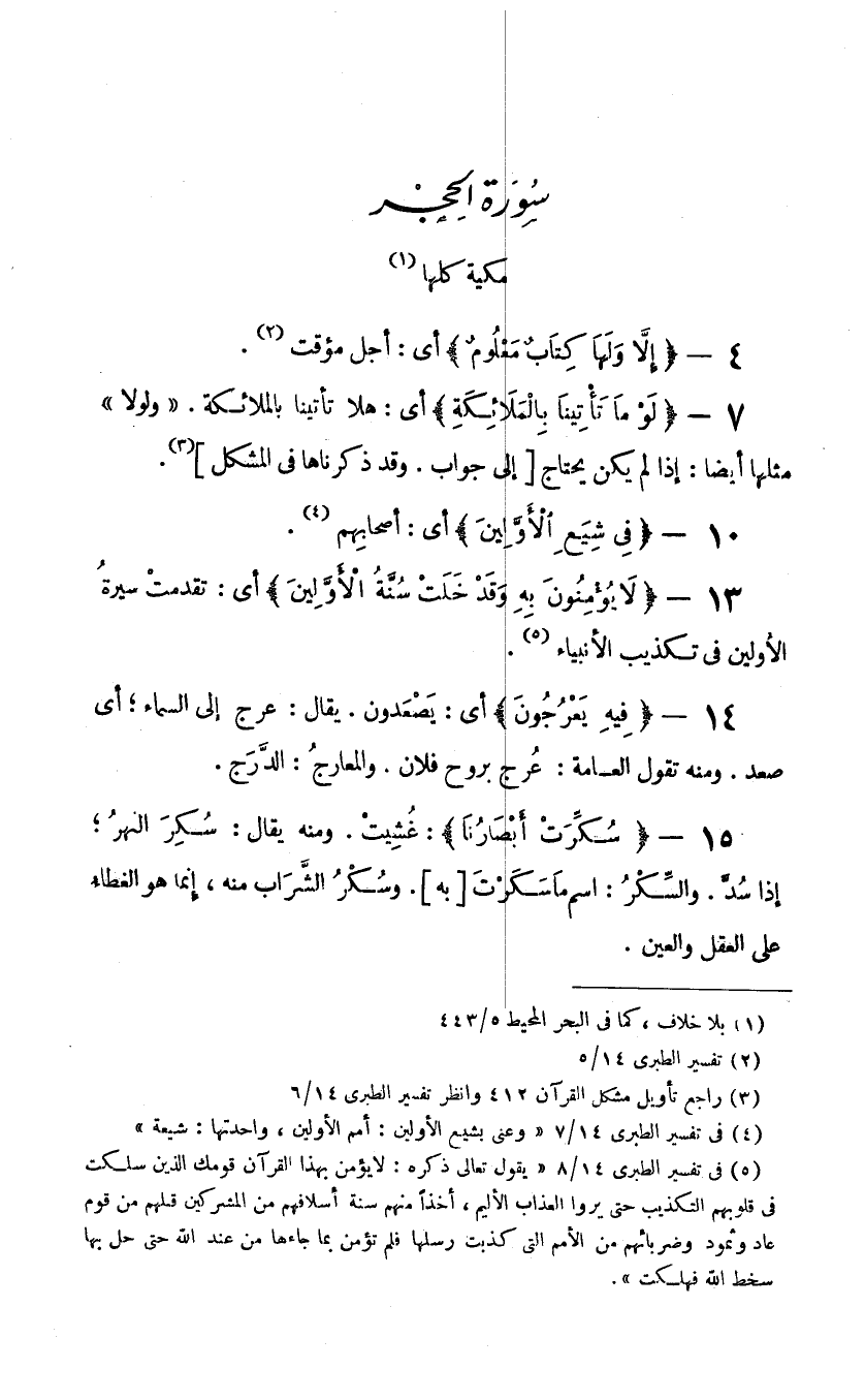 (4) في تفسير الطبري 14/8 "يقول تعالى ذكره: لا يؤمن بهذا القرآن قومك الذين سلكت في قلوبهم التكذيب حتى يروا العذاب الأليم، أخذا منهم سنة أسلافهم من المشركين قبلهم من قوم عاد وثمود وضربائهم من الأمم التي كذبت رسلها فلم تؤمن بما جاءها من عند الله حتى حل بها سخط الله فهلكت".
