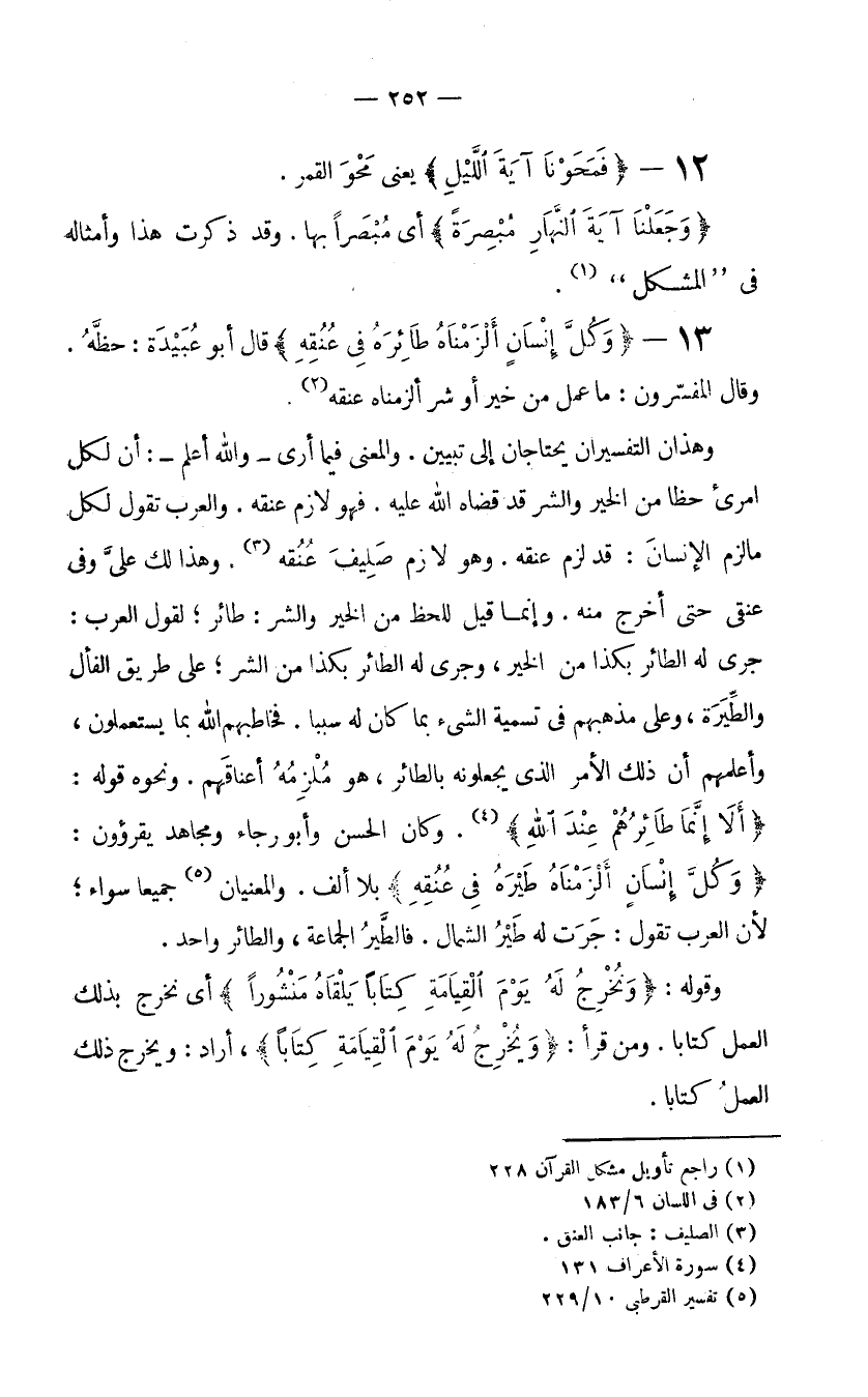 13- {وَكُلَّ إِنْسَانٍ أَلْزَمْنَاهُ طَائِرَهُ فِي عُنُقِهِ} قال أبو عُبَيْدَة: حظَّهُ. وقال المفسّرون: ما عمل من خير أو شر ألزمناه عنقه (2) . وهذان التفسيران يحتاجان إلى تبيين. والمعنى فيما أرى- والله أعلم -: أن لكل امرئ حظًّا من الخير والشر قد قضاه الله عليه. فهو لازم عنقه. والعرب تقول لكل ما لزم الإنسانَ: قد لزم عنقه. وهو لازم صَلِيفَ عُنُقه (3) . وهذا لك عليَّ وفي عنقي حتى أخرج منه. وإنما قيل للحظ من الخير والشر: طائر؛ لقول العرب: جرى له الطائر بكذا من الخير، وجرى له الطائر بكذا من الشر؛ على طريق الفأل والطِّيَرة، وعلى مذهبهم في تسمية الشيء بما كان له سببًا. فخاطبهم الله بما يستعملون، وأعلمهم أن ذلك الأمر الذي يجعلونه بالطائر، هو مُلْزِمُه أعناقَهم. ونحوه قوله: {أَلا إِنَّمَا طَائِرُهُمْ عِنْدَ اللَّهِ} (4) وكان الحسن وأبو رجاء ومجاهد يقرؤون: (وكل إنسان ألزمناه طيره في عنقه) بلا ألف. والمعنيان جميعًا سواء؛ لأن العرب تقول: جَرَت له طَيْرُ الشمال. فالطَّيْرُ الجماعة، والطائر واحد.