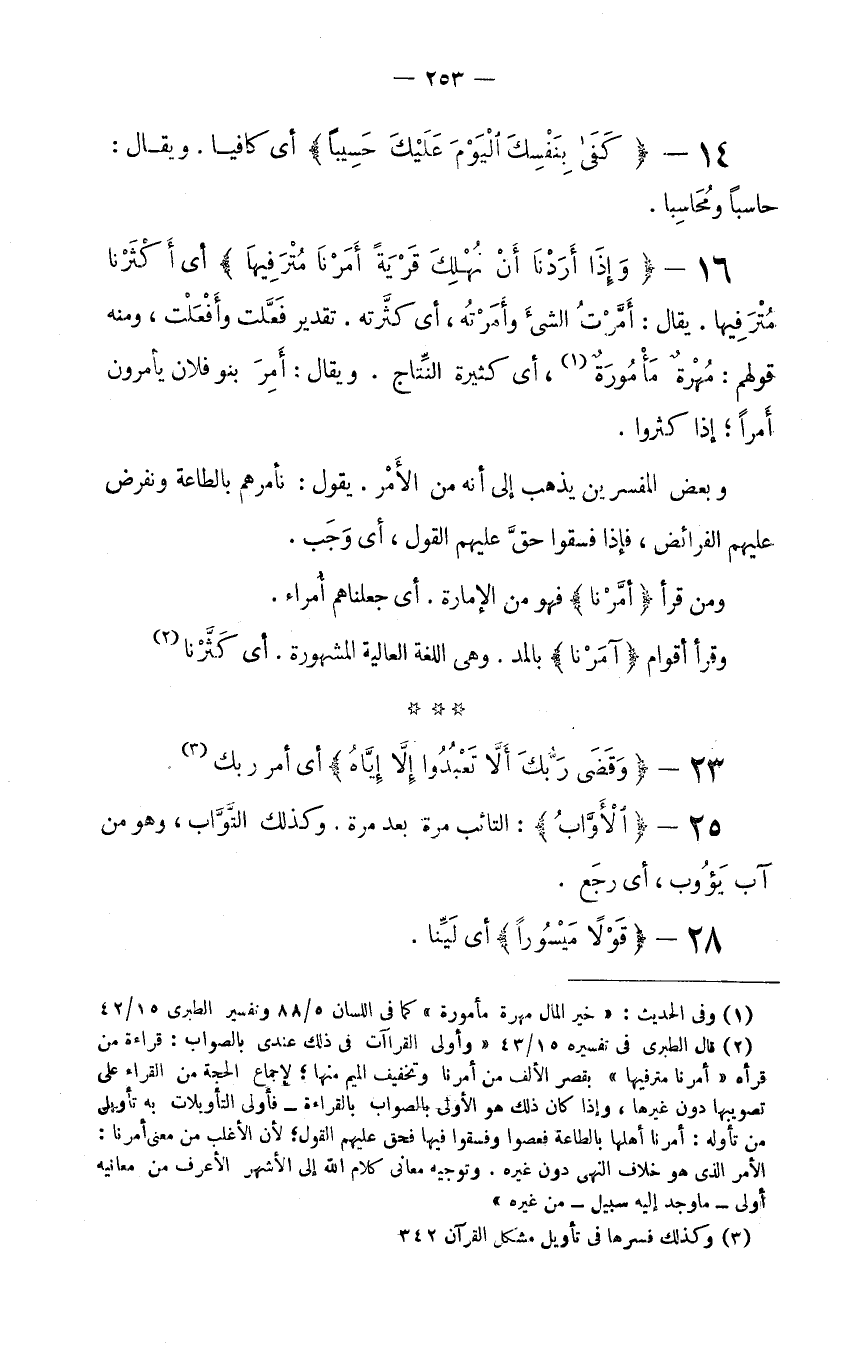 16- {وَإِذَا أَرَدْنَا أَنْ نُهْلِكَ قَرْيَةً أَمَرْنَا مُتْرَفِيهَا} أي أكْثَرْنَا مُتْرَفِيهَا. يقال: أَمَّرْتُ الشيءَ وأمَرْتُه، أي كثَّرته. تقدير فَعَّلت وأَفْعَلْت، ومنه قولهم: مُهْرَةٌ مَأْمُورَةٌ (1) أي كثيرة النِّتاج. ويقال: أَمِرَ بنو فلان يأمرون أمرًا؛ إذا كثروا.