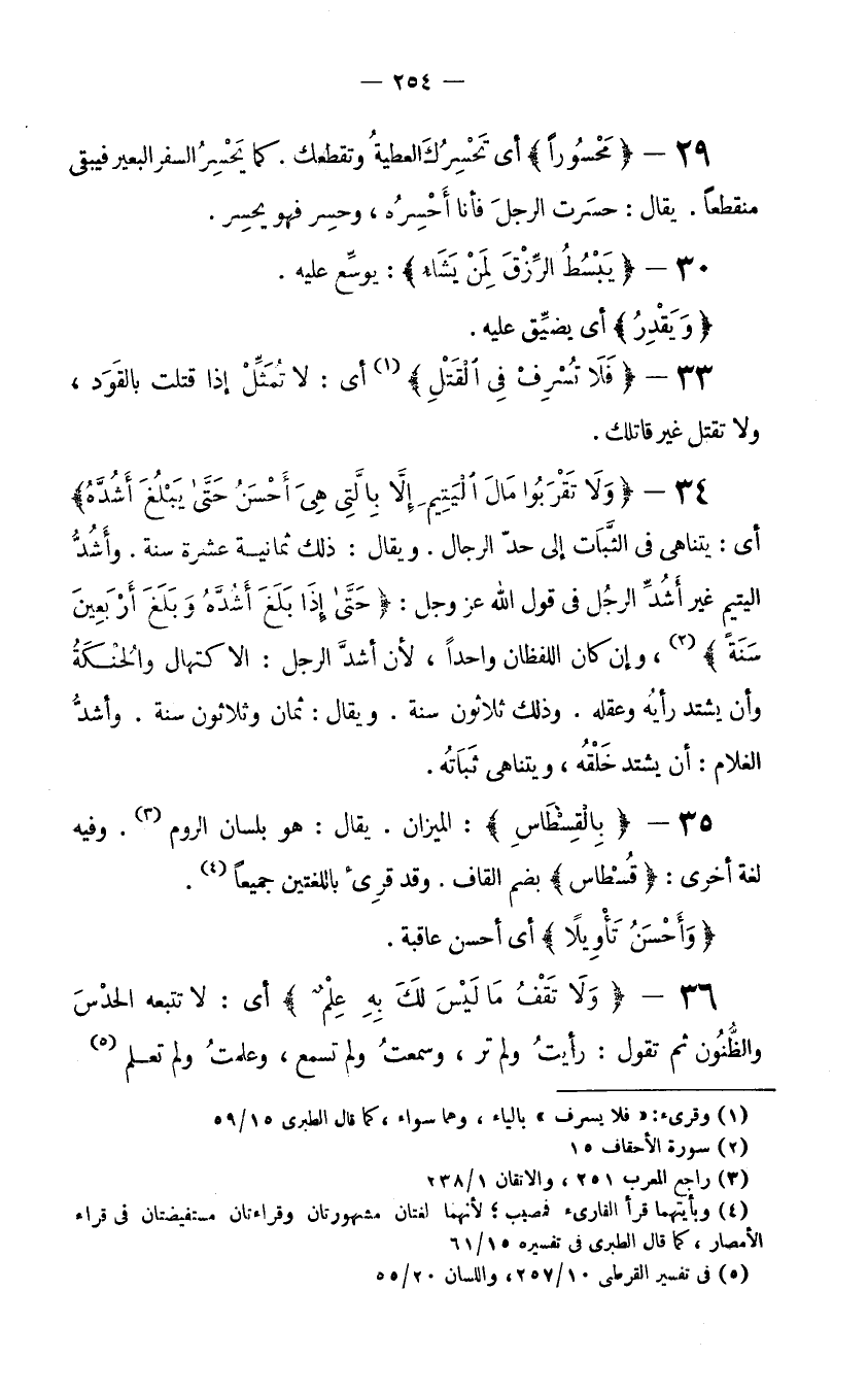 35- {بِالْقِسْطَاسِ} الميزان، يقال: هو بلسان الروم (3) . وفيه لغة أخرى: (قُسْطَاس) بضم القاف. وقد قرِئ باللغتين جميعًا (4) .