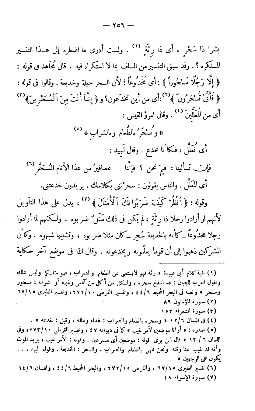 (1) بقية كلام أبي عبيدة "رئة فهو لا يستغني عن الطعام والشراب، فهو مثلكم وليس بملك، وتقول العرب للجبان: قد انتفخ سحره، ولكل من أكل من آدمي وغيره أو شرب: مسحور ومسحر" ونصه في البحر المحيط 6/44، وتفسير القرطبي 10/272، وتفسير الطبري 15/67.