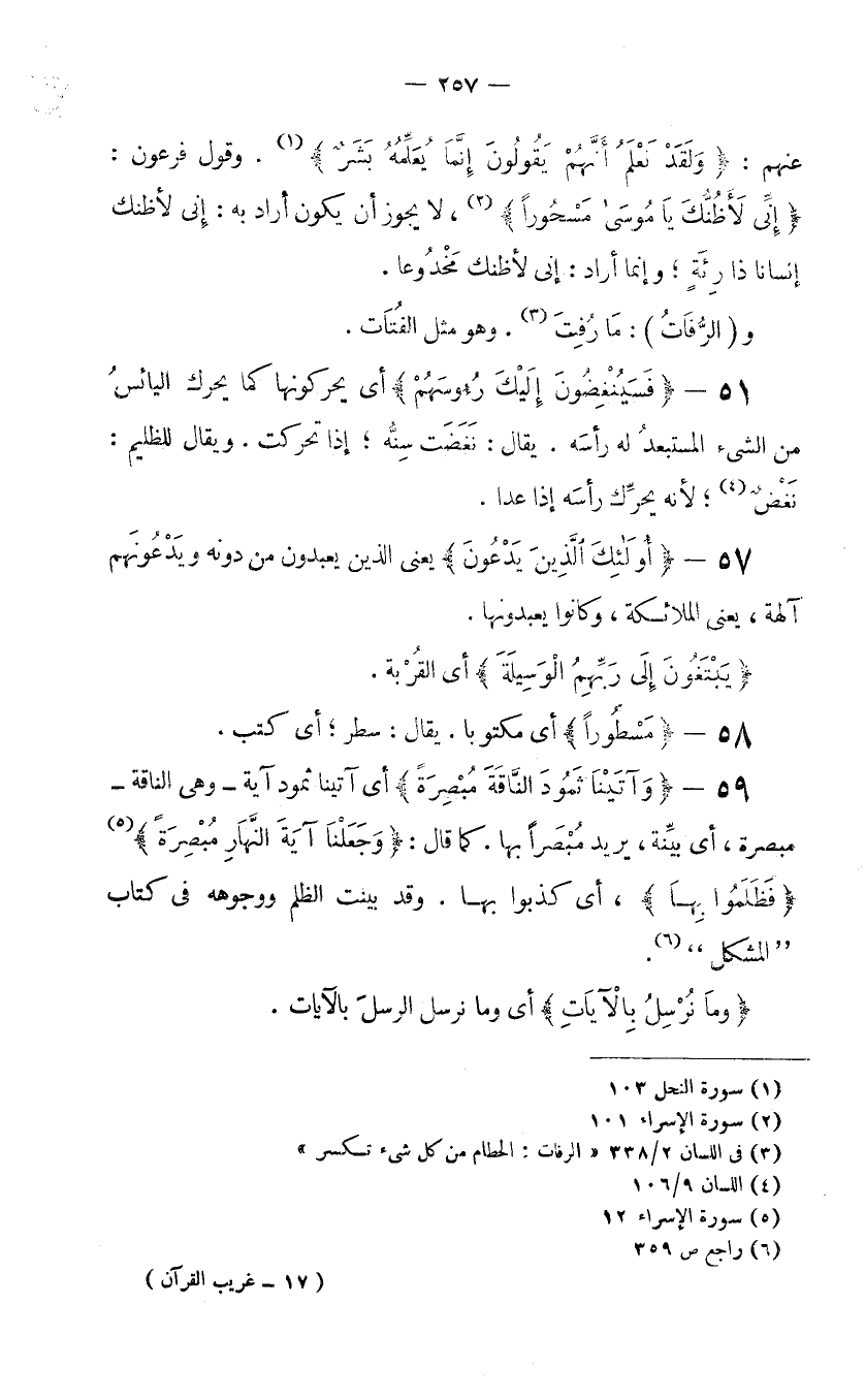 59- {وَآتَيْنَا ثَمُودَ النَّاقَةَ مُبْصِرَةً} أي آتينا ثمود آية – وهي الناقة – مبصرة، أي بيِّنة، يريد مُبْصَرًا بها. كما قال: {وَجَعَلْنَا آيَةَ النَّهَارِ مُبْصِرَةً} (4) .
