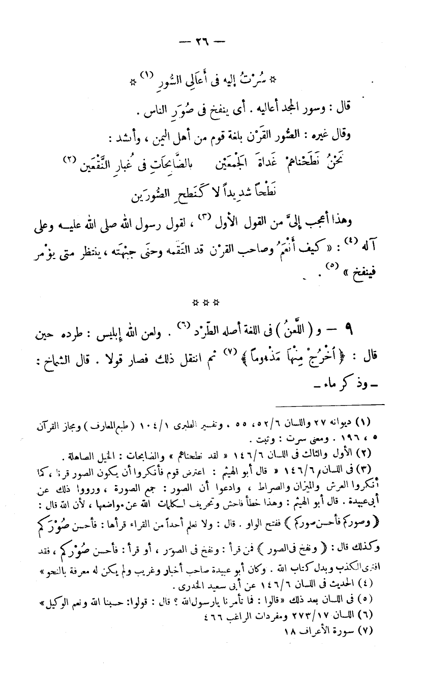 (3) في اللسان 6/ 146 "قال أبو الهيثم: اعترض قوم فأنكروا أن يكون الصور قرنا، كما أنكروا العرش والميزان والصراط، وادعوا أن الصور: جمع الصورة، ورووا ذلك عن أبي عبيدة. قال أبو الهيثم: وهذا خطأ فاحش وتحريف لكلمات الله عن مواضعها، لأن الله قال: (وصوركم فأحسن صوركم) ففتح الواو. قال: ولا نعلم أحدا من القراء قرأها: فأحسن صُوْرَكم، وكذلك قال: (ونفخ في الصور) فمن قرأ: ونفخ في الصوَر، أو قرأ: فأحسن صُوْركم، فقد افترى الكذب وبدل كتاب الله. وكان أبو عبيدة صاحب أخبار وغريب ولم يكن له معرفة بالنحو".
