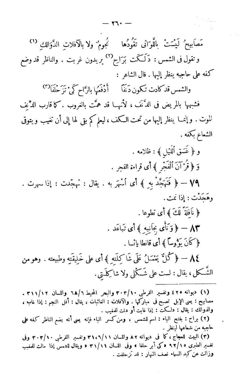 (1) ديوانه 425 وتفسير القرطبي 10/303 والبحر المحيط 6/68 واللسان 12/311. مصابيح: يعني الإبل تصبح في مباركها. والآفلات: الغائبات، يقال: أفل النجم: إذا غاب، والدوالك: يقال: دلكت: إذا غابت أو دنت للمغيب.