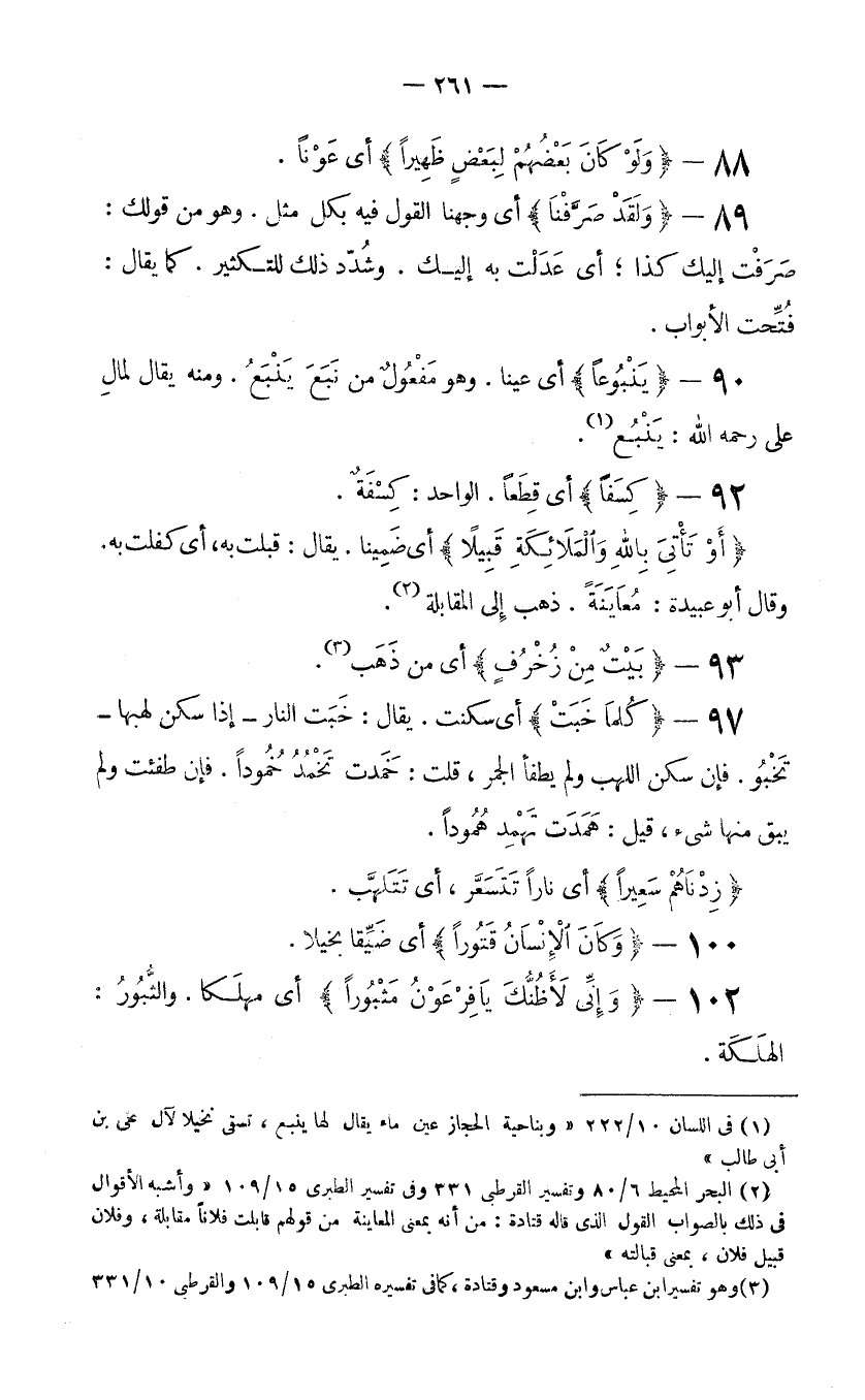 90- {يَنْبُوعًا} أي عينا وهو مَفْعُولٌ من نَبَعَ يَنْبَعُ. ومنه يقال لمالِ علي رحمه الله: يَنْبُع (1) .