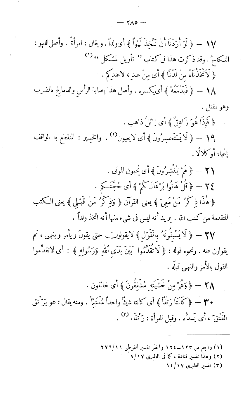 17- {لَوْ أَرَدْنَا أَنْ نَتَّخِذَ لَهْوًا} أي ولدًا. ويقال: امرأةً. وأصل اللهو: النكاحُ. وقد ذكرت هذا في كتاب "تأويل المشكل" (1) .