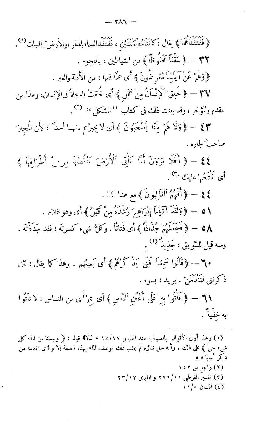 37- {خُلِقَ الإِنْسَانُ مِنْ عَجَلٍ} أي خُلقتْ العجلةُ في الإنسان، وهذا من المقدم والمؤخر، وقد بينت ذلك في كتاب "المشكل" (2) .