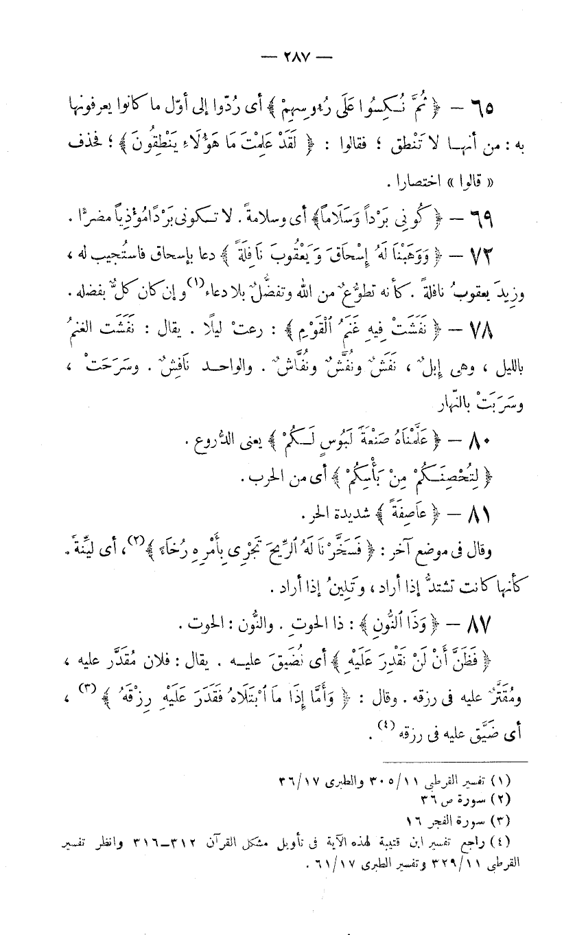(3) راجع تفسير ابن قتيبة لهذه الآية في تأويل مشكل القرآن 312-316 وانظر تفسير القرطبي 11/329 وتفسير الطبري 17/61.