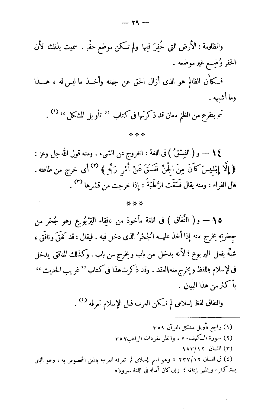 15- و (النِّفَاق) في اللغة مأخوذ من نافِقاء اليَرْبُوعِ وهو جُحْر من جِحَرتِه يخرج منه إذا أخذ عليه الجُحْر الذي دخل فيه. فيقال: قد نَفَقَ ونافَق، شبِّه بفعل اليربوع؛ لأنه يدخل من باب ويخرج من باب. وكذلك المنافق يدخل في الإسلام باللفظ ويخرج منه بالعقد. وقد ذكرت هذا في كتاب "غريب الحديث" بأكثر من هذا البيان.