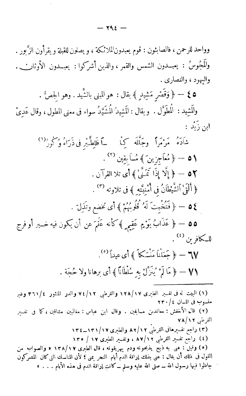 45- {وَقَصْرٍ مَشِيدٍ} يقال: هو المبني بالشِّيد. وهو الجِصُّ. والمَشِيد: المُطَوَّل. ويقال: المَشِيدُ والمُشَيَّد سواء في معنى المطول، وقال عَدِيّ بن زَيْد: