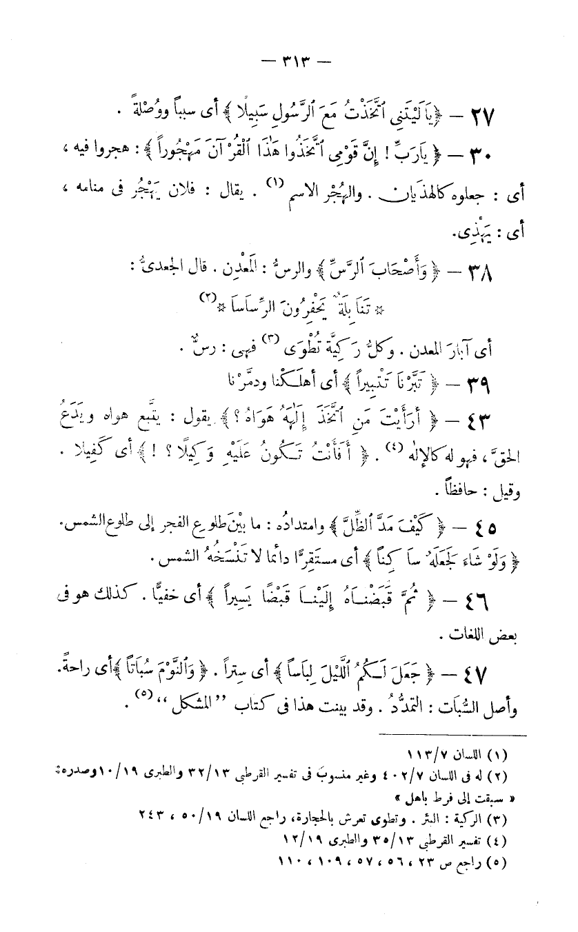 30- {يَا رَبِّ إِنَّ قَوْمِي اتَّخَذُوا هَذَا الْقُرْآنَ مَهْجُورًا} هجروا فيه، أي: جعلوه كالهذَيان. والهُجْر الاسم. يقال: فلان يَهْجُر في منامه، أي: يَهْذِي.