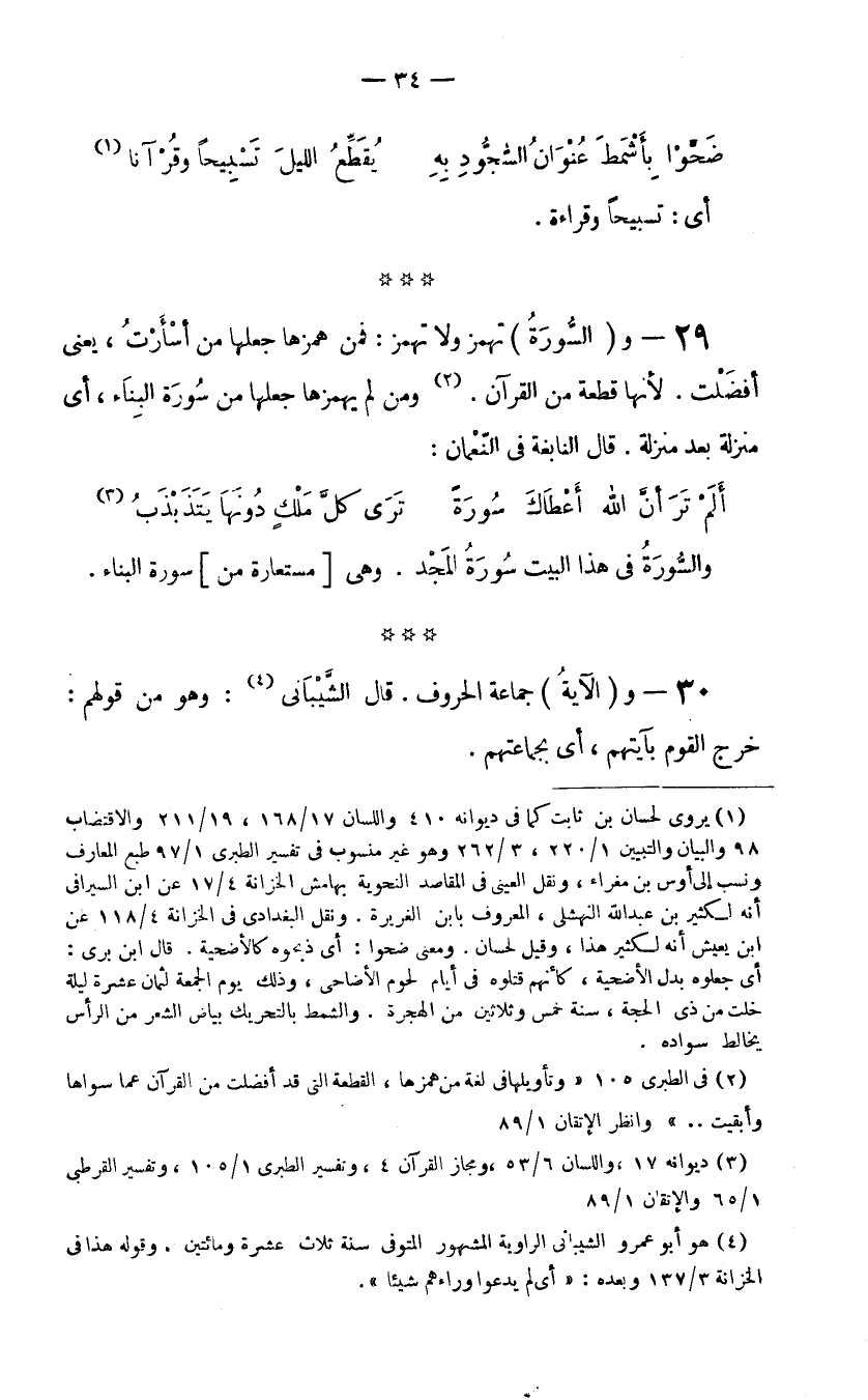 29- و (السُّورَةُ) تهمز ولا تهمز: فمن همزها جعلها من أسْأَرْتُ، يعني أفضَلْت. لأنها قطعة من القرآن. (2) ومن لم يهمزها جعلها من سُورَة البِنَاء، أي منزلة بعد منزلة. قال النابغة في النّعْمان:
