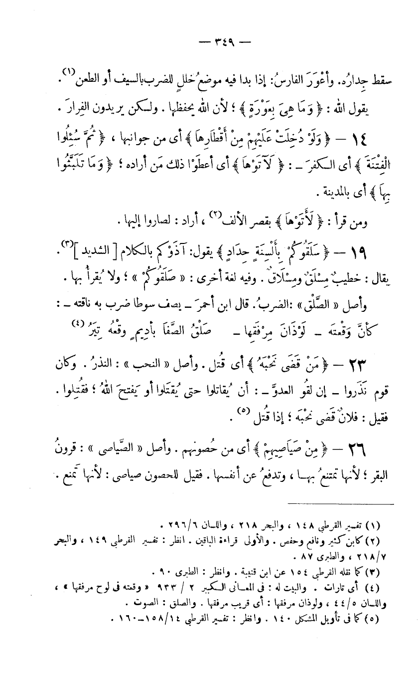 23- {مَنْ قَضَى نَحْبَهُ} أي قُتل. وأصل "النحب": النذرُ. وكان قوم نَذَروا -إن لقوا العدوَّ-: أن يُقاتلوا حتى يُقتَلوا أو يَفتحَ اللهُ؛ فقُتِلوا. فقيل: فلانٌ قَضى نحْبَه؛ إذا قُتل (4) .