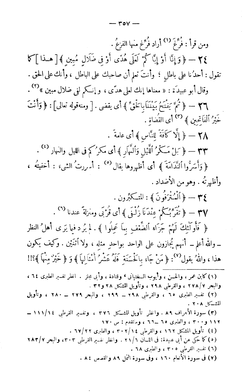 (1) كابن عمر، والحسن، وأيوب السختياني، وقتادة، وأبي مجلز. انظر تفسير الطبري 22/64، والبحر 7/278، والقرطبي 14/298، وتأويل المشكل 28 و 32.
