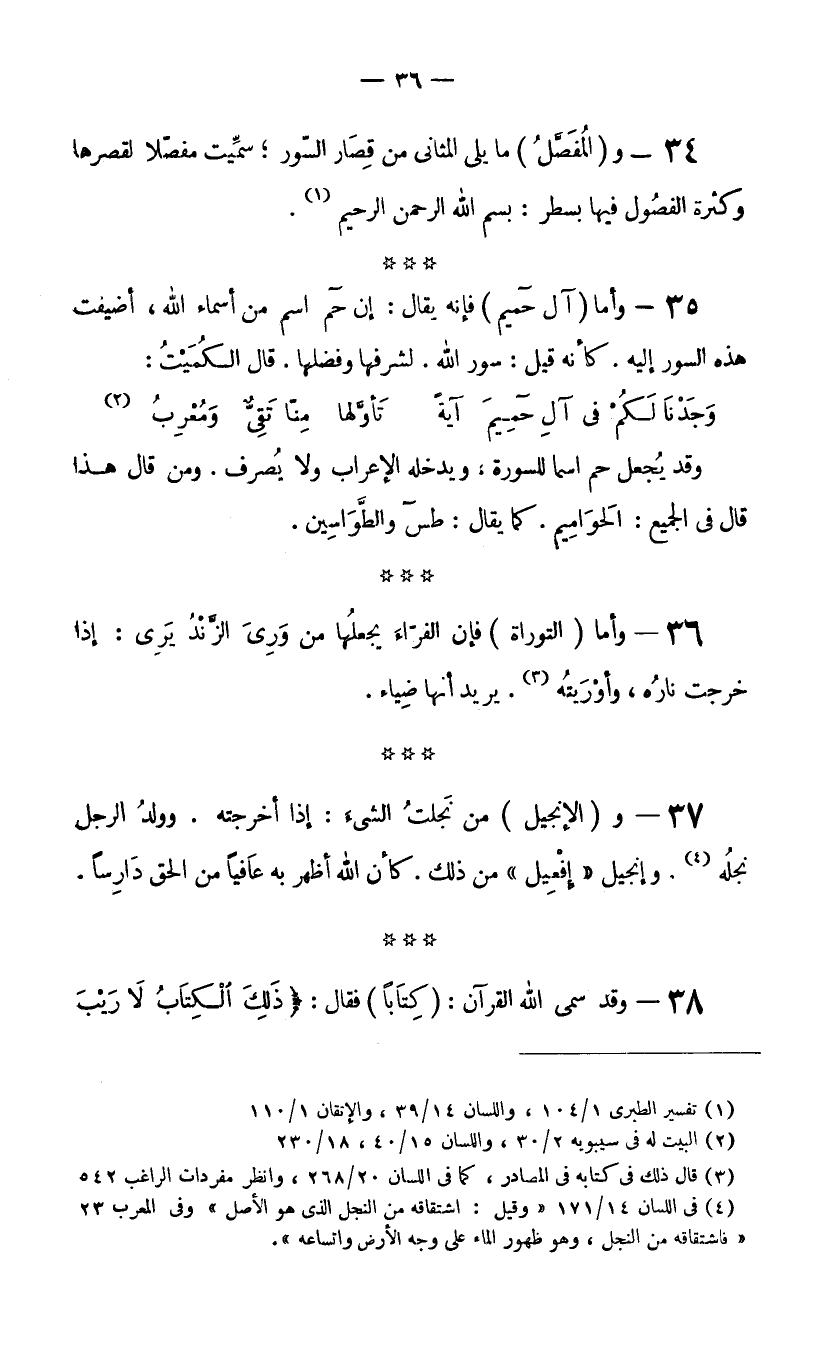 34- و (المُفَصَّلُ) ما يلي المثاني من قِصَار السّور؛ سمِّيت مفصّلا لقصرها وكثرة الفصُول فيها بسطر: بسم الله الرحمن الرحيم.