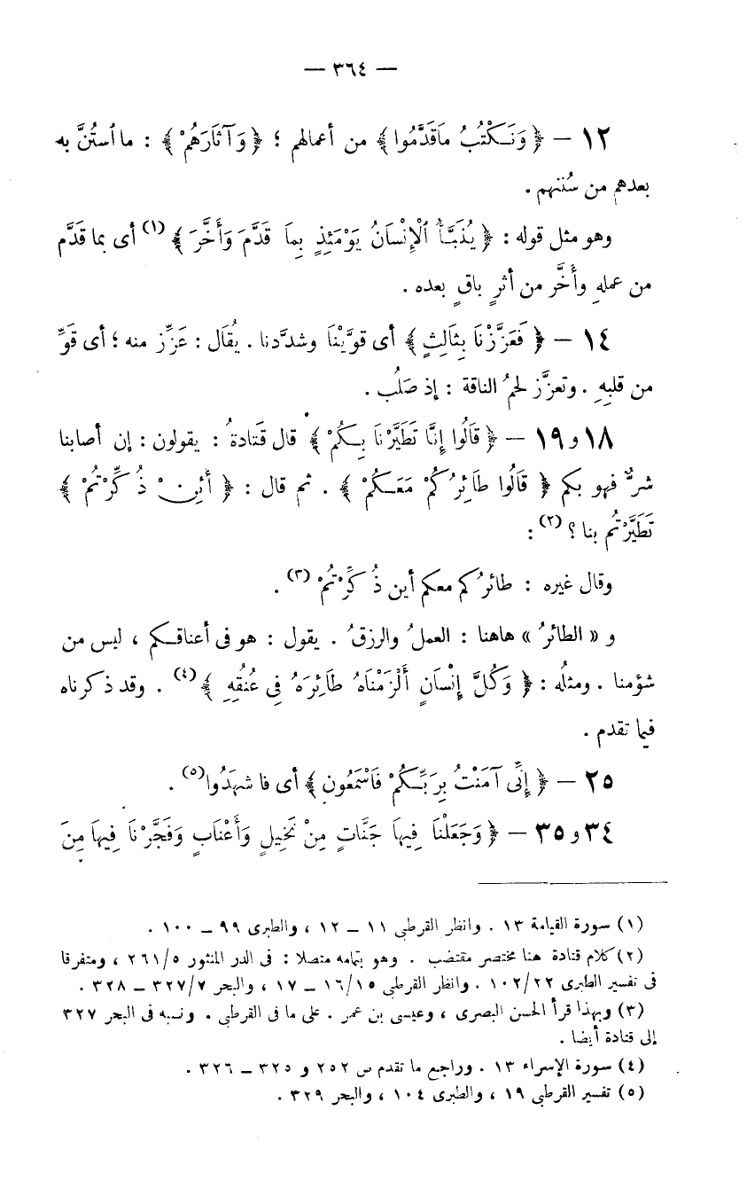 12- {وَنَكْتُبُ مَا قَدَّمُوا} من أعمالهم؛ {وَآثَارَهُمْ} ما استُنَّ به بعدهم من سُننهم. وهو مثل قوله: {يُنَبَّأُ الإِنْسَانُ يَوْمَئِذٍ بِمَا قَدَّمَ وَأَخَّرَ} (1) أي بما قَدَّم من عملهِ وأخَّر من أثرٍ باقٍ بعده.