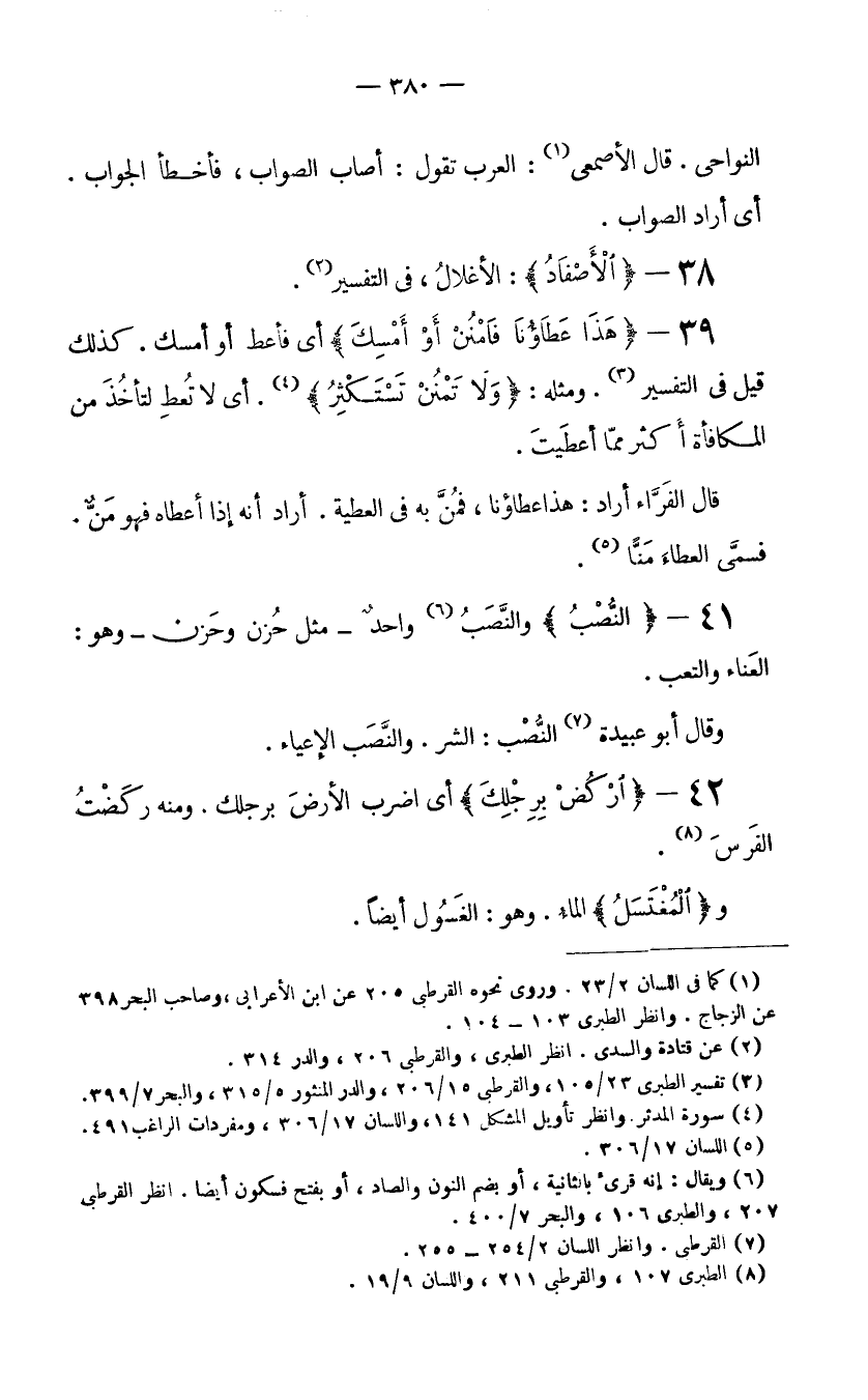 39- {هَذَا عَطَاؤُنَا فَامْنُنْ أَوْ أَمْسِكْ} أي فأعط أو أمسك. كذلك قيل في التفسير (3) . ومثله: {وَلا تَمْنُنْ تَسْتَكْثِرُ} (4) . أي لا تُعطِ لتأخُذَ من المكأفاة أكثر مِمَّا أعطَيْتَ.
